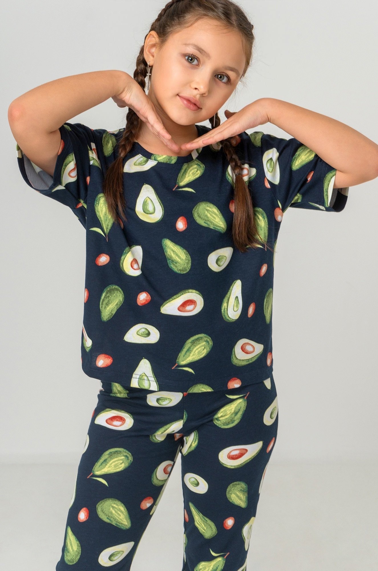 Детская пижама с брюками для девочки-подростка выполнена из натурального 100% хлопка. Свободный крой не сковывает движений и позволяет ребенку всегда оставаться активным, а милый принт Авокадо подарит отличное настроение.