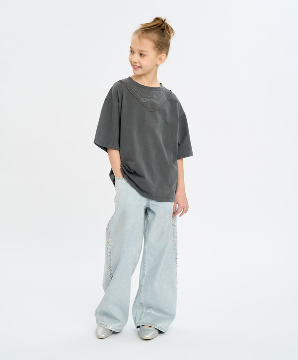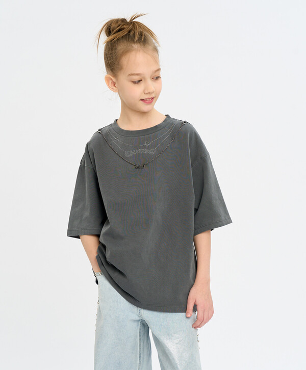 Оверсайз футболка для девочки сделана из хлопковой кулирки, поэтому тонкая, дышащая и простая в уходе. Свободный крой без прилегания и короткие рукава до локтя будто созданы для активных девчонок. Детскую футболку на лето легко внедрить в повседневный, спортивный и домашний гардероб. Модель серого цвета в оттенке жако с эффектом варки или стирки смотрится интересно. Трендовости футболке в стиле гранж добавляет вышивка на горловине и цепочка на карабинах.