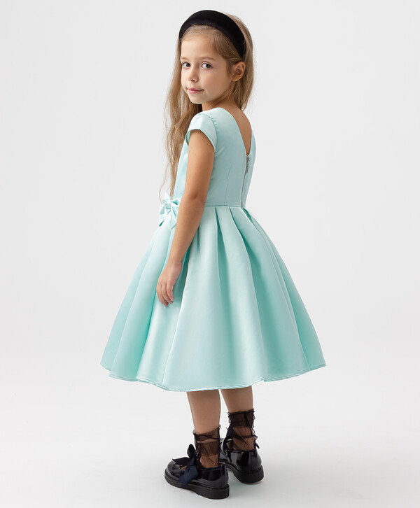 Нарядное платье голубого цвета с пышной юбкой и большим декоративным бантом создаст праздничное настроение для юной принцессы.