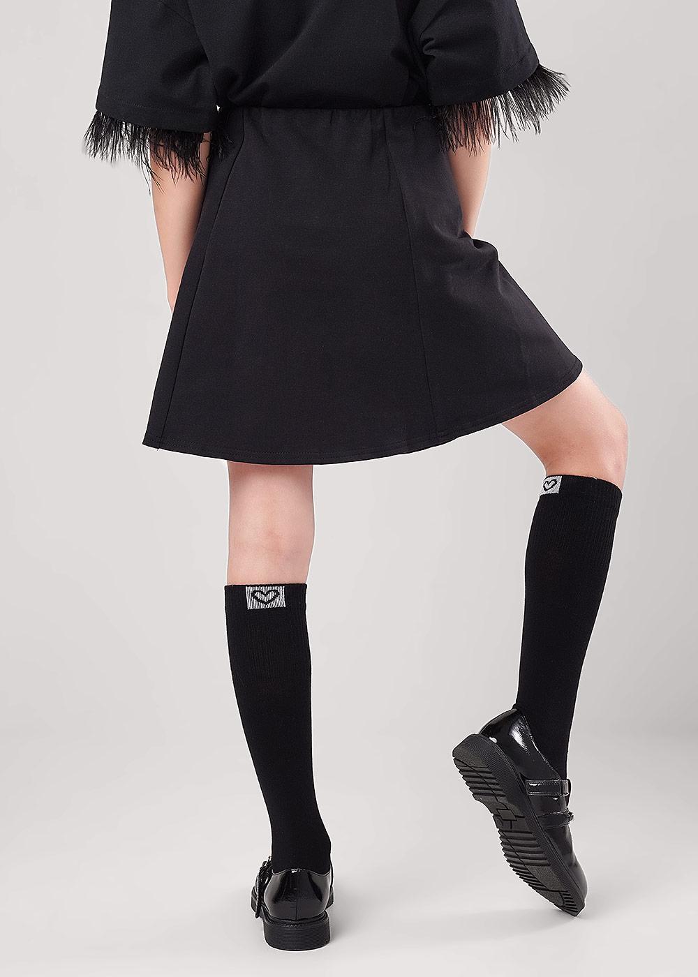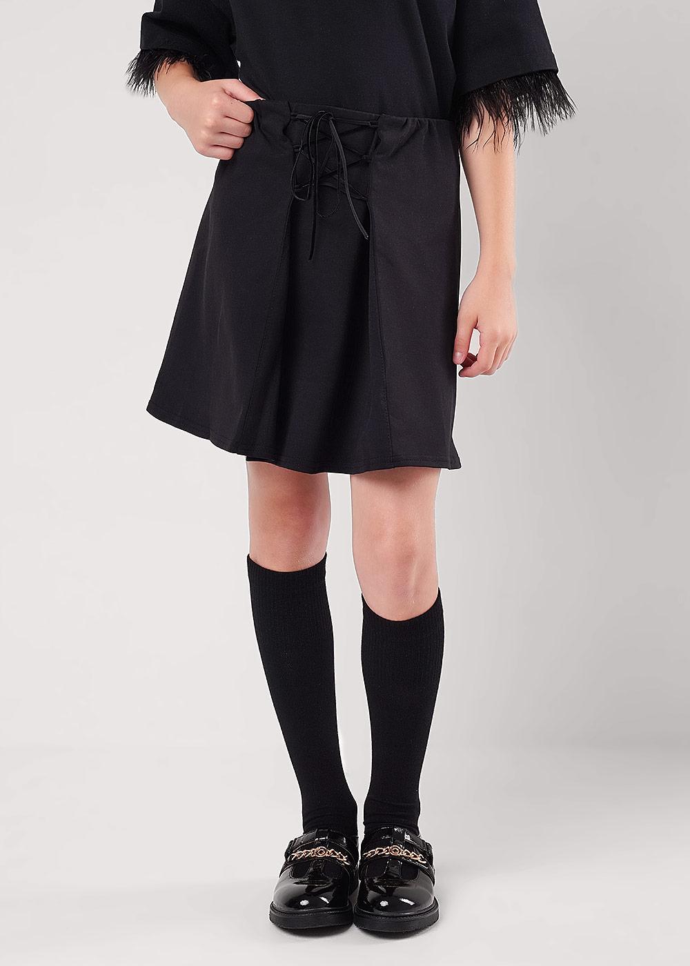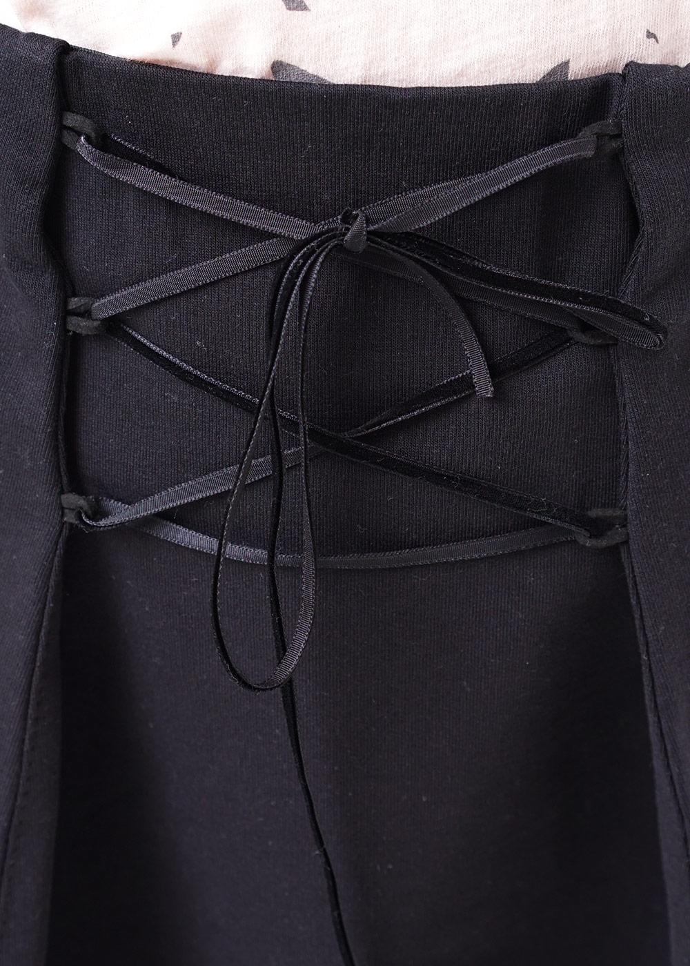 юбка из футера с актуальной шнуровкой по переду. А-силуэт с рельефами по переду и спинке. Пояс резинкой по изнанке