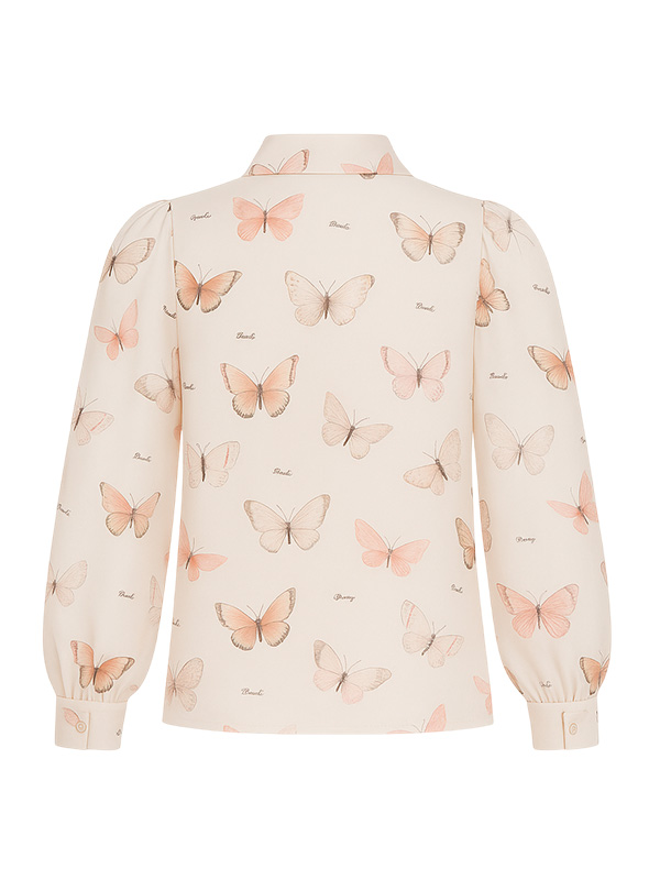 Воздушная блузка в кремово-молочном оттенке украшена изящным принтом с бабочками в пастельных тонах. Воротник с завязывающимся бантом придаёт образу утончённость, а пышные рукава с манжетами добавляют лёгкости и женственности. Ткань мягко драпируется и приятно ощущается на коже. Блузка легко комбинируется с юбками, брюками или джинсами, позволяя создавать как романтичные, так и более строгие луки. Прекрасный выбор для школы, прогулок или особых случаев.