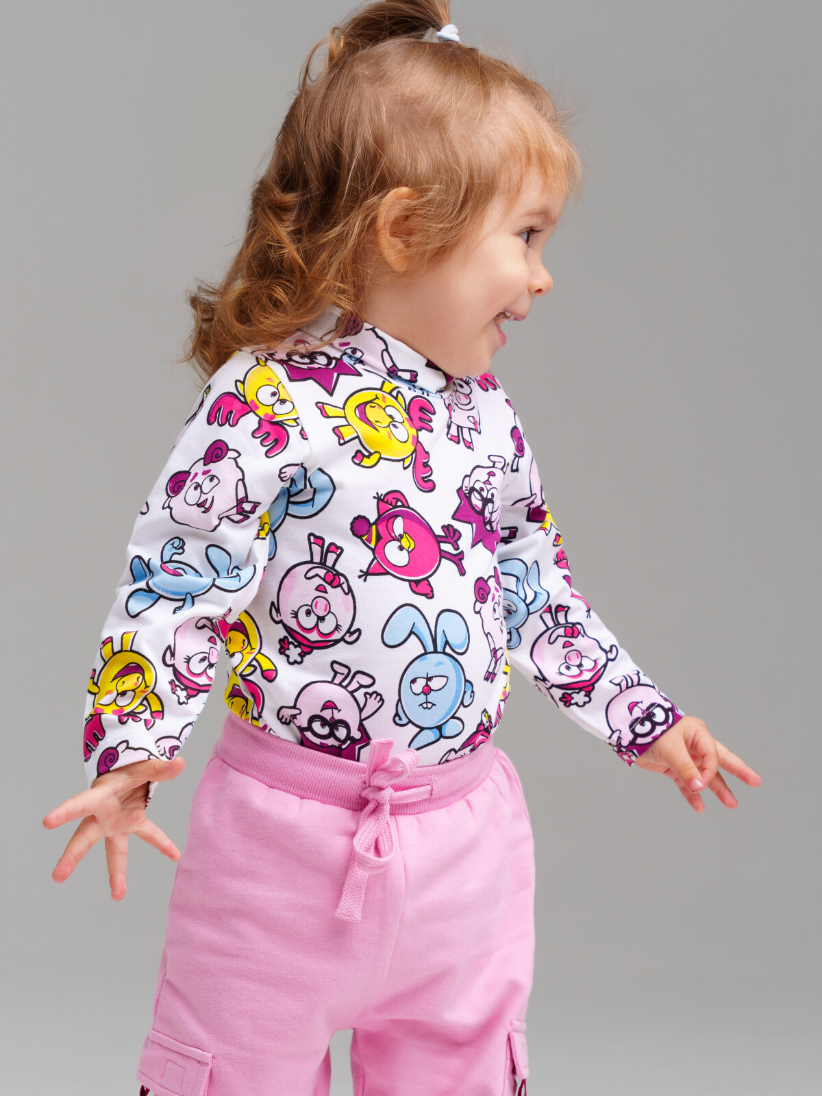 Детское боди для девочки. Боди с длинным рукавом из натурального хлопкового двойного трикотажа. Высокое содержание хлопка. Кнопки внизу – 2 ряда, боди растет вместе с малышом. Модель из капсульной коллекции СМЕШАРИКИ, соберите полный образ в едином стиле!