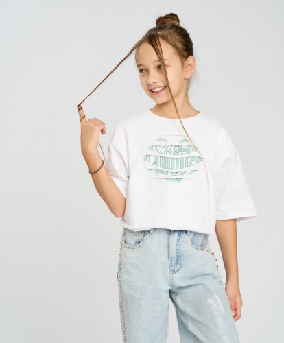 715 р. 1100 р. Футболка с коротким рукавом для девочки белая оверсайз с принтом Button Blue