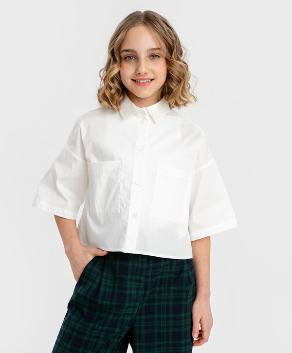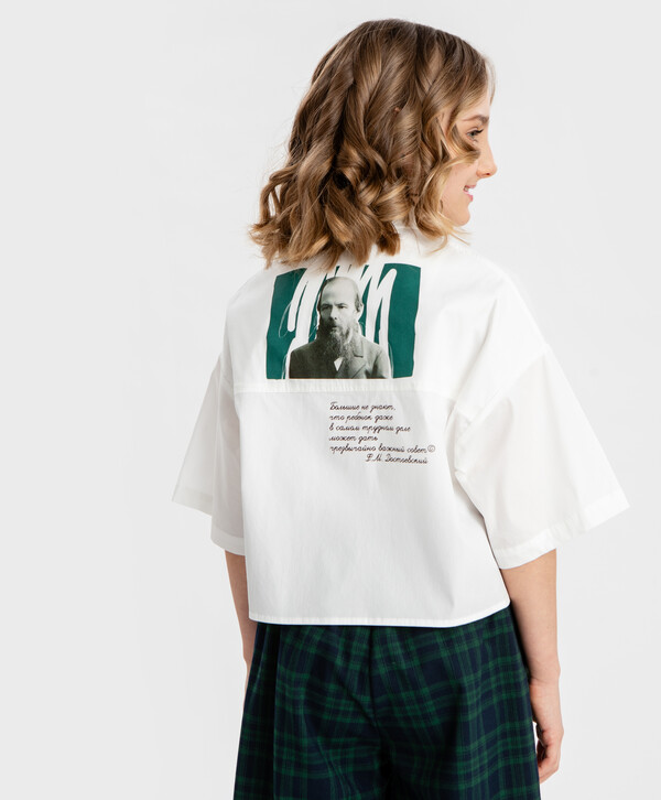 Укороченная белая рубашка с принтом Достоевский для девочки. Это уникальный предмет гардероба, который точно выделит школьницу из толпы учеников в белых рубашках и блузах. Кроп-топ модель выполнена с отложным воротником и крупными накладными карманами спереди. Застегивается на пуговицы. Оверсайз модель от Button Blue со спущенной линией плеча подойдет детям с разным типом фигуры. А благодаря неклассической форме и дизайну, рубашку можно сочетать как со школьной формой, так и с повседневной одеждой. На спинку изделия нанесен водный- и фотопринты. Изображен Федор Достоевский и одна из его цитат на вечную тему отцов и детей. Несмотря на крупный принт, рубашка достаточно универсальная за счет своего цвета. С ней можно составить множество образов, скрыв декор на спине под пиджаком, джинсовкой или кардиганом. Изделие выполнено из хлопка с добавлением нейлона и эластана, поэтому мягкое, хорошо держит форму, пропускает воздух. Плотность блузы средняя - слегка просвечивается. Следуйте рекомендациям по уходу, указанным на вшивной этикетке.