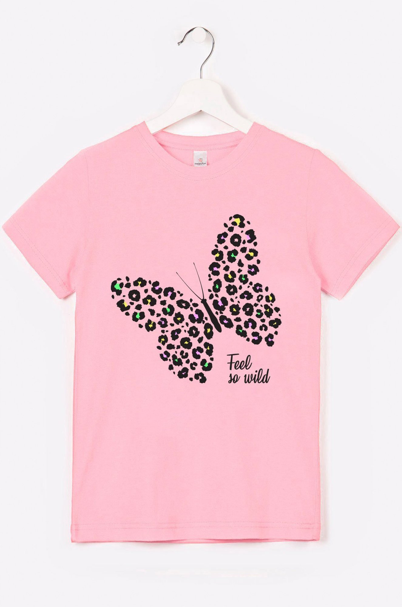 Вдохновляйся и порхай как бабочка! Детская футболка для девочки и девочки подростка выполнена из 100% хлопка. Летняя модель украшена красивым рисунком Бабочка и надписью Feel so wild.