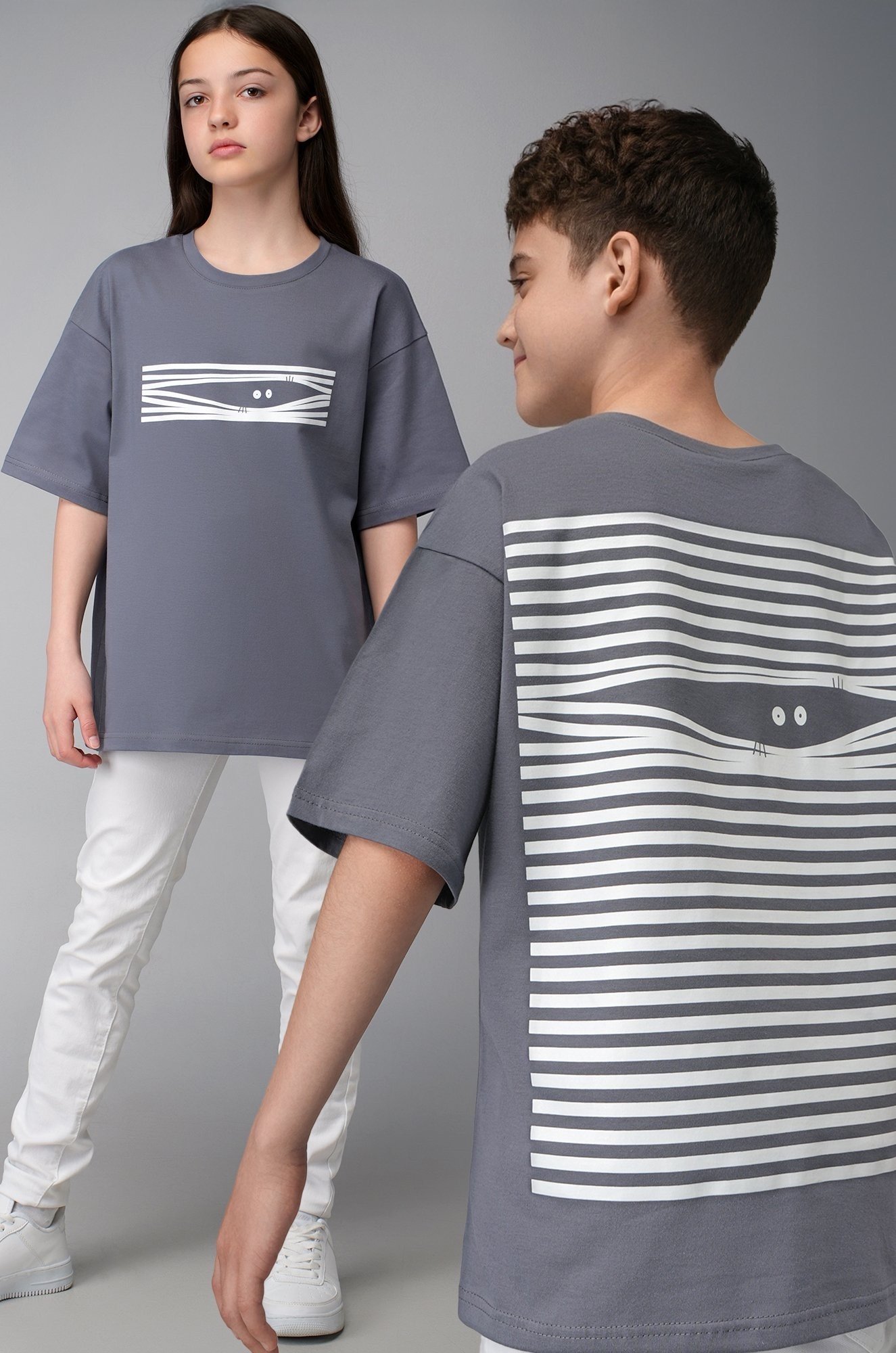Футболка оверсайз для девочек, мальчиков и подростков выполнена из 100% хлопка. Детская футболка представлена в сером цвете и украшена прикольным рисунком на спине и на груди.