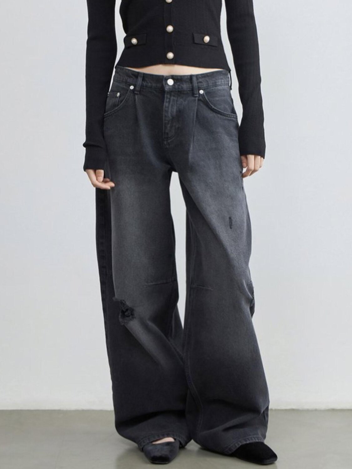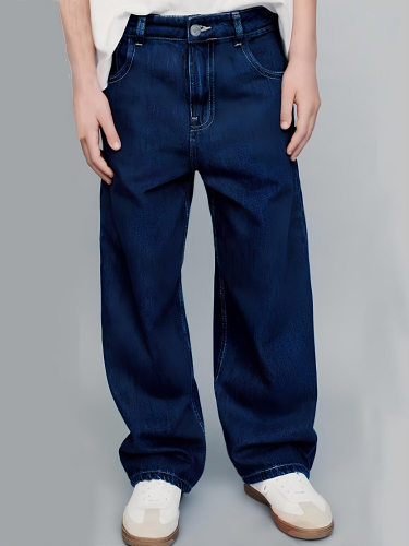 Джинсы объемного кроя со средней посадкой. Защипы на поясе. Эффект естественных заломов и потертостей. Увеличенные передние карманы, накладные карманы сзади. Застежка на молнию и металлическую пуговицу.