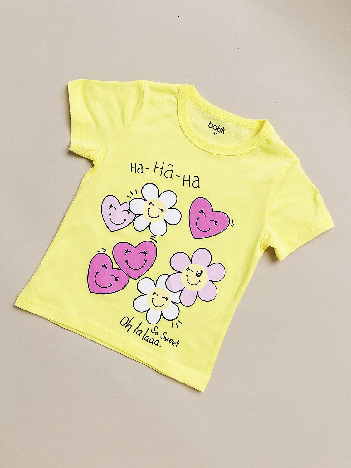 Футболка с коротким рукавом для девочки желтая из натурального хлопка. Детская футболка с милым цветочным принтом выполнена из мягкого трикотажа. Лёгкая ткань со 100% хлопковым составом хорошо пропускает воздух и позволяет телу дышать.