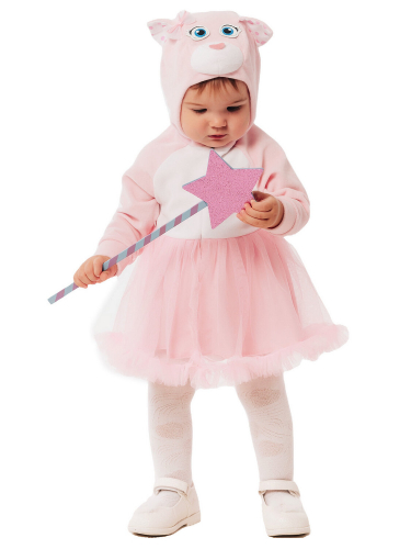 Костюм детский Котенка Жемчужинки для девочек. Яркий оранжево-розовый наряд идеален для тематических праздников, утренников и фотосессий. Устройте костюмированное чаепитие для девочек по мотивам мультика "Королевские питомцы". Костюм сшит по лицензии с компанией Дисней. В комплекте платье и шапка-маска.