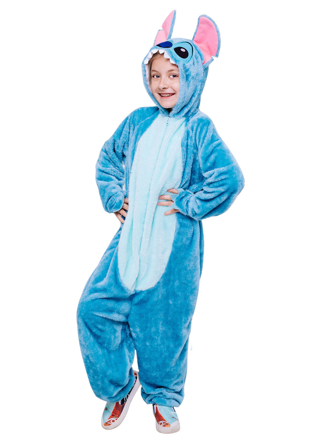 Костюм Стича из мультсериала "Лило и Стич" новогодний для мальчиков и девочек. Костюм представлен в виде синего комбинезона на молнии с капюшоном. Такие комбинезоны в виде популярных персонажей еще называют кигуруми. Костюм изготовлен по лицензии с компанией Дисней.