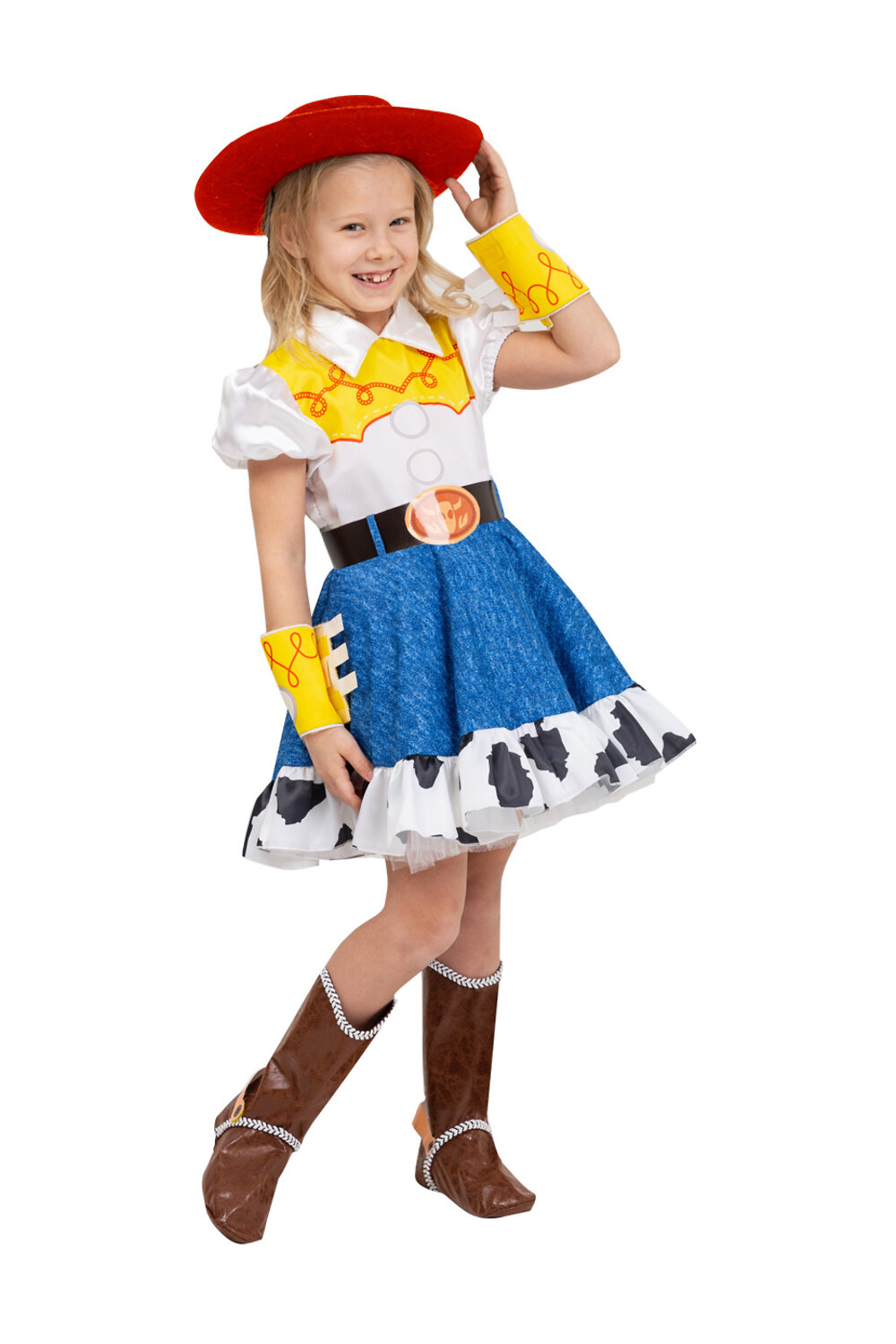 Костюм Ковбойши Джесси детский - новый образ, который представляет героиню мультфильма История Игрушек. Комплект костюма включает блузку, юбку, пояс, шляпу, сапоги.
