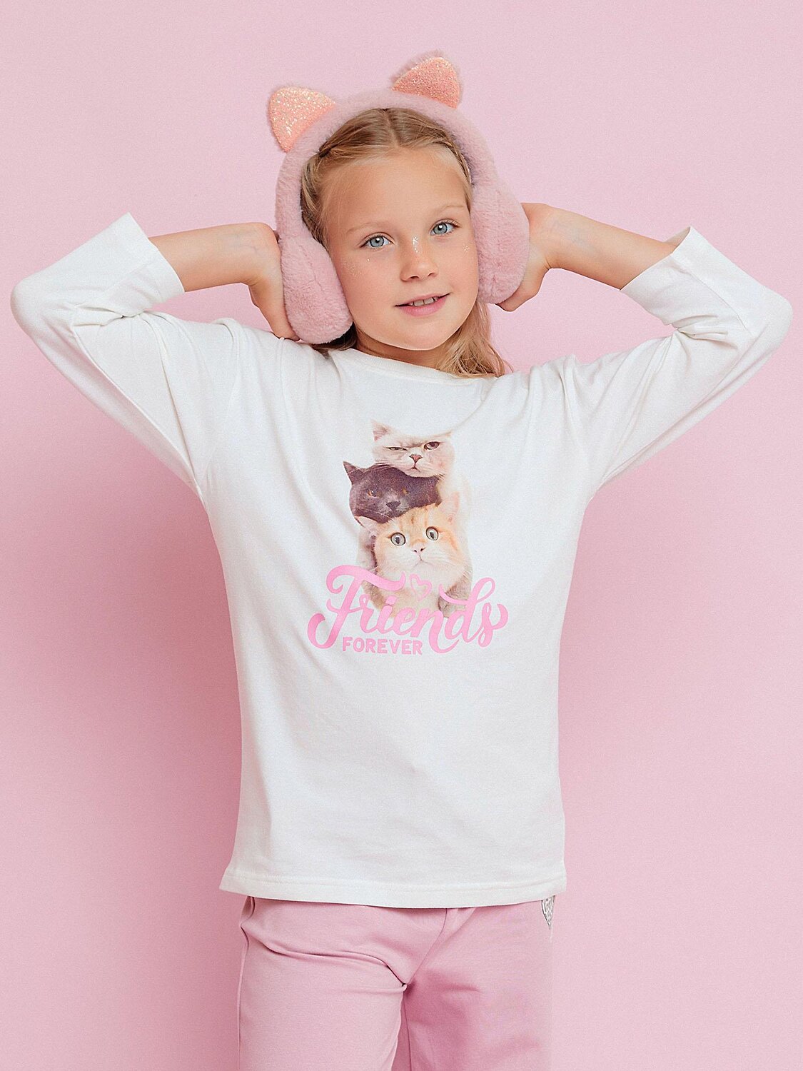 Лонгслив с длинным рукавом для девочки белый из натурального хлопка. Стильный лонгслив с принтом в виде котят. Лёгкая ткань с хлопковым составом хорошо пропускает воздух и позволяет телу дышать.