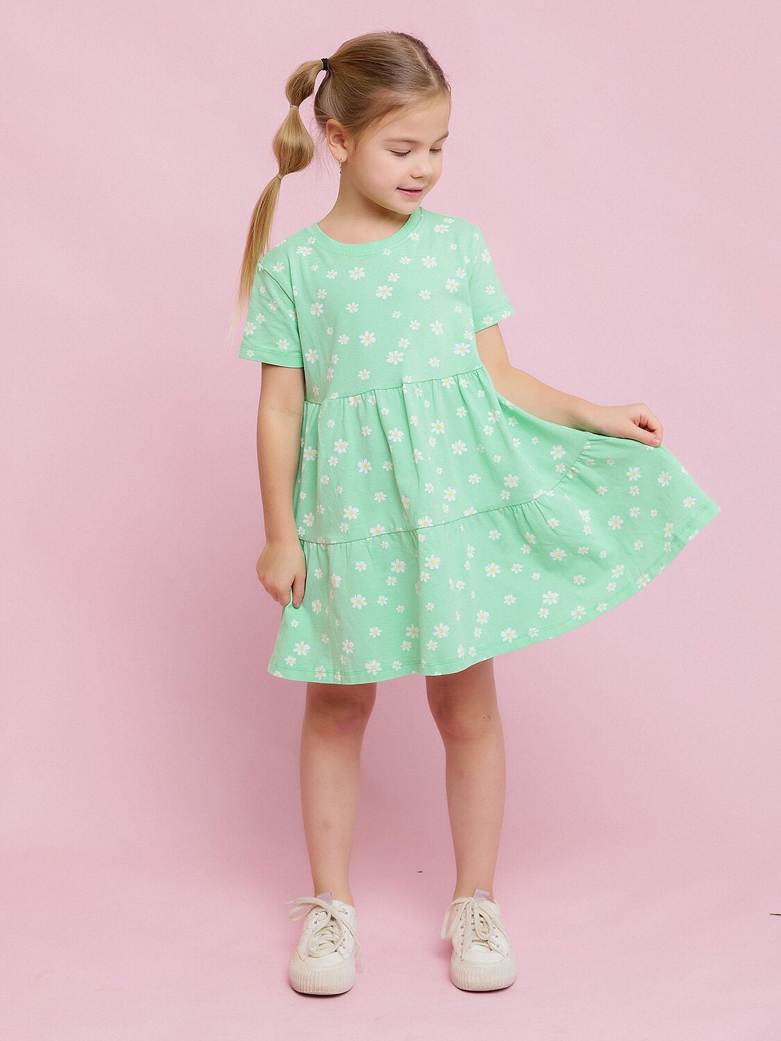Платье с коротким рукавом для девочек в мятном цвете с принтом в виде ромашек. Лёгкое летнее платье из набивного трикотажа супрем. Ярусы со сборками делают его более пышным и невесомым.