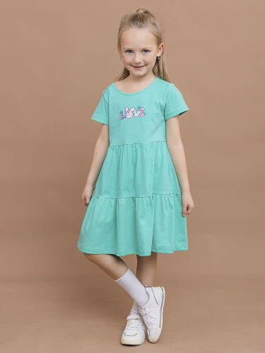 Платье для девочки с коротким рукавом желтое из натурального хлопка. На груди милый принт, круглая горловина. Широкая оборка по низу. Отличный выбор для комфортной повседневной носки летом на прогулку и в любое другое время года в помещении: дома, в садике, в гостях.