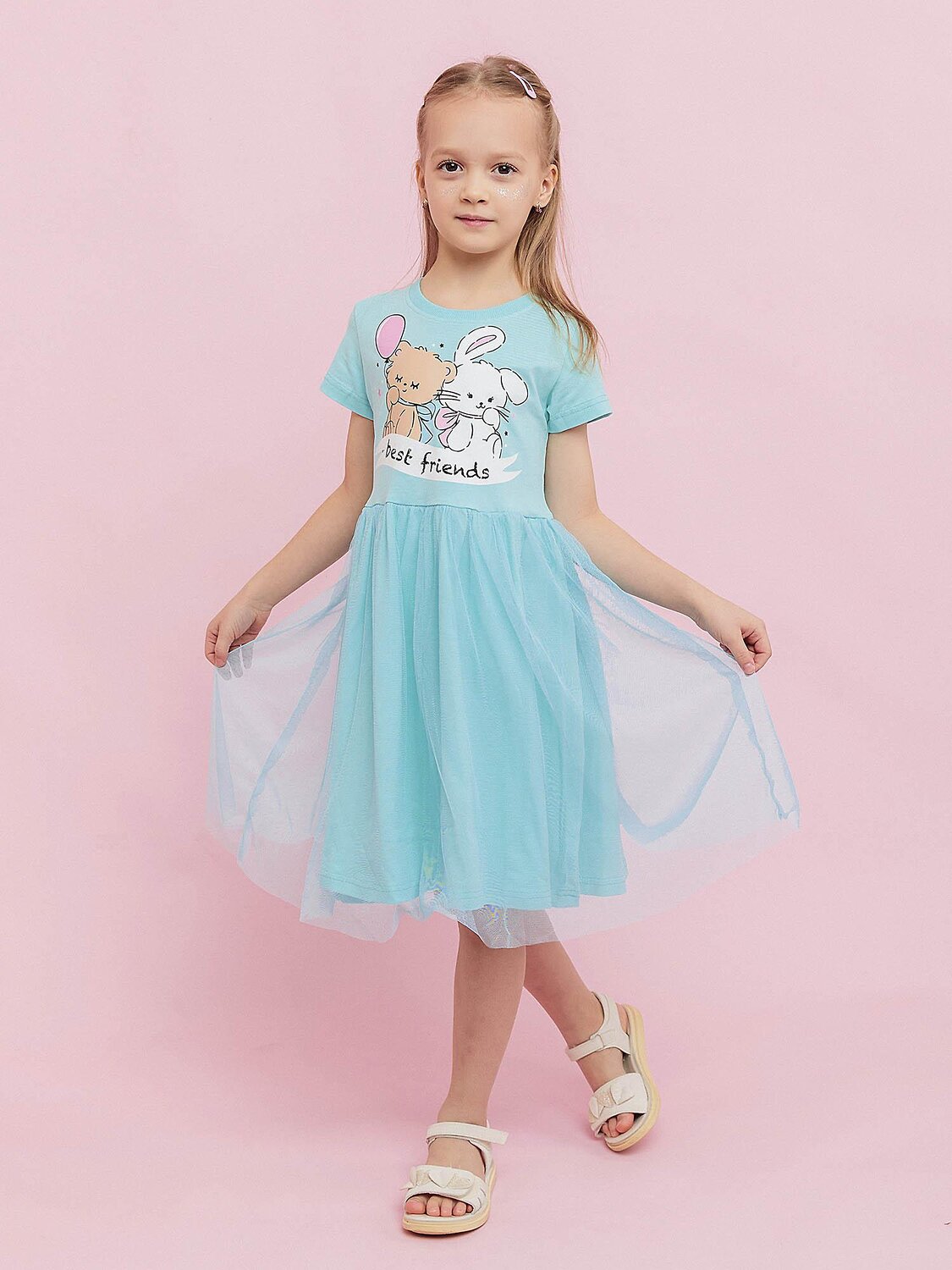 Платье для девочки бирюзовое трикотажное из супрема пенье. Платье летнее с коротким рукавом из мягкой натуральной ткани. На груди симпатичный рисунок в виде милых зверят. Юбка длинная двухслойная с верхним слоем из сетчатой ткани.