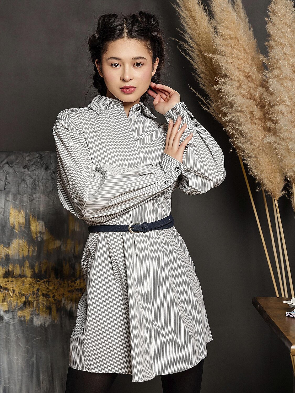 Элегантная удлиненная рубашка-платье в серую полоску. Удлиненный крой, создающий стильный силуэт, с акцентом на талии благодаря изящным защипам. Объемные спущенные рукава с высокой манжетой — модный тренд, добавляющий образу легкость и утонченность. Супатная застежка на пуговицах для аккуратного и лаконичного вида. В комплекте стильный ремень, который подчеркнет талию и завершит образ. Идеально для создания как повседневных, так и более нарядных луков. Сочетается с обувью на каблуке, кедами или ботинками — в зависимости от стиля.
