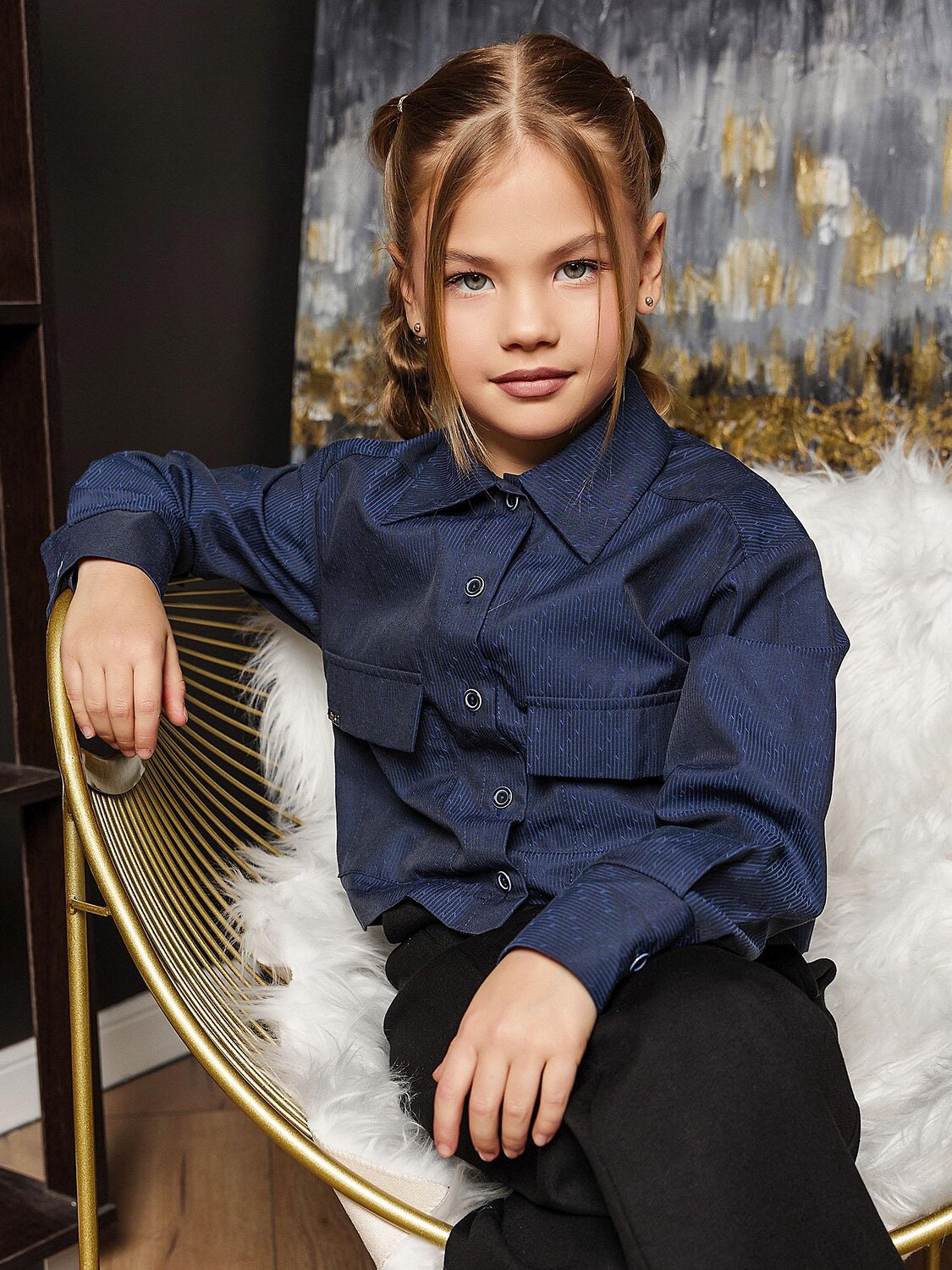 Укороченная рубашка для девочки выполнена из смесовой ткани с рисунком из хлопка и полиэстера. Модель дополнена классическим отложным воротником, длинными рукавами и застежкой на пуговицы. Вместительные накладные карманы с клапанами.