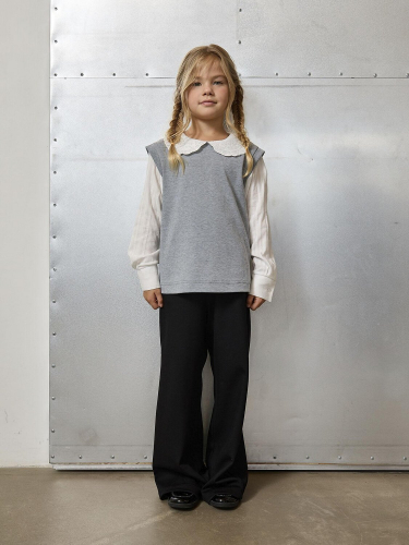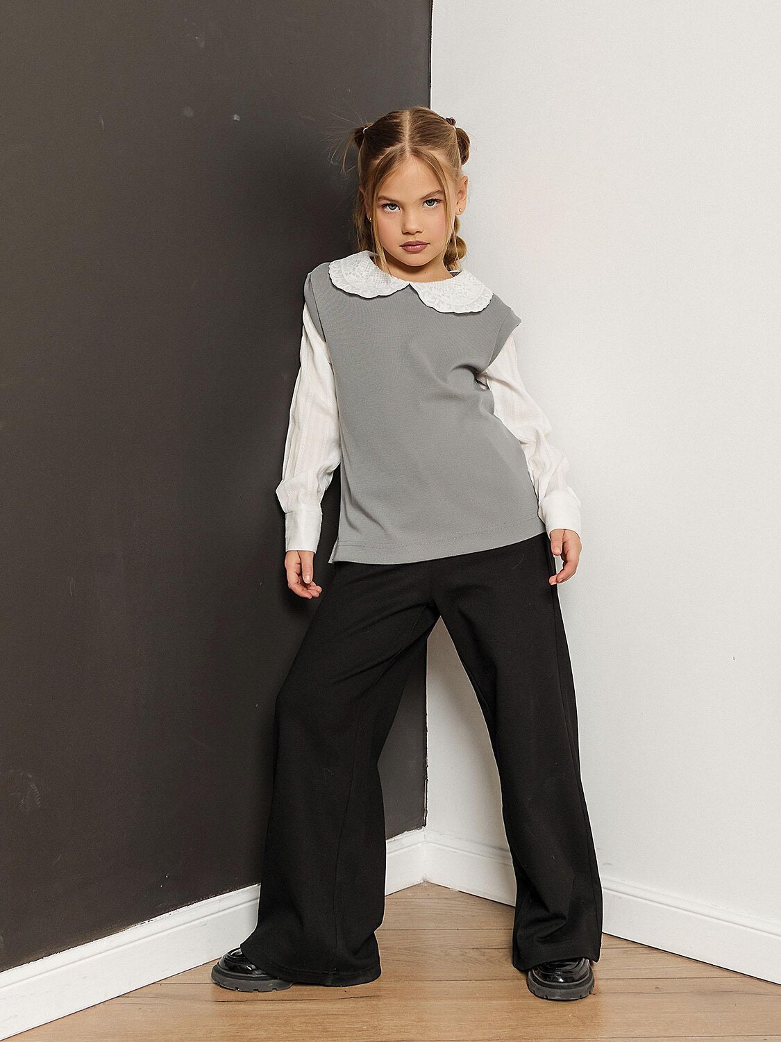 Стильная рубашка-обманка в сером цвете имитирует эффект многослойности: сочетает элегантную рубашку и уютный трикотажный жилет в одной модели. Иллюзия двух изделий создает визуально интересный и стильный образ без лишних слоев. Кружевной воротник добавляет изысканности, а длинные рукава с манжетами завершают лаконичный крой. Приятный серый оттенок делает рубашку универсальной для базового гардероба.