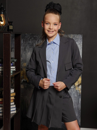 Модный укороченный жилет для девочки голубой с эффектом спущенного плеча. Укороченный крой подчеркивает талию и визуально вытягивает силуэт. Костюмный воротник добавляет строгости и элегантности. Декоративные клапаны создают интересные акценты. Качественный подклад обеспечивает комфорт при носке. Идеально сочетается с рубашками, водолазками и блузками. Прекрасно комбинируется с юбками и брюками. Подходит как для школьного образа, так и для праздничных луков. Спущенное плечо создает модный oversize-эффект. Укороченная длина - главный тренд сезона.