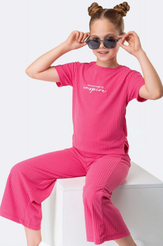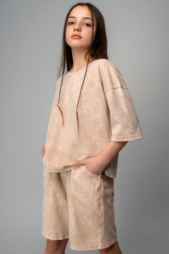 Спортивный костюм для девочек и девочек-подростков представлен в приглушенном зеленом цвете. Трикотажный летний костюм состоит из футболки оверсайз и шорт до колена. Вареный эффект придает образу яркости и индивидуальности.