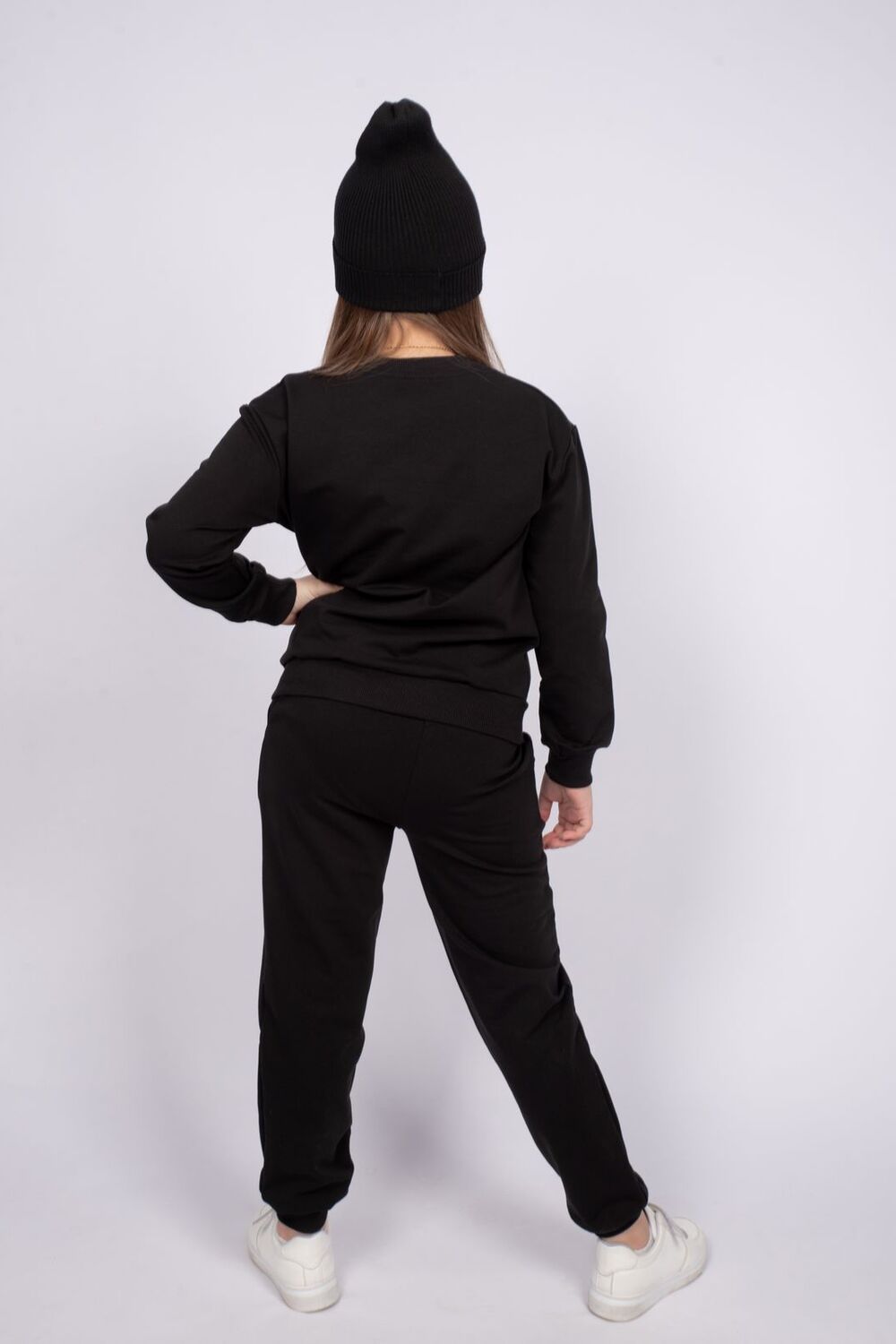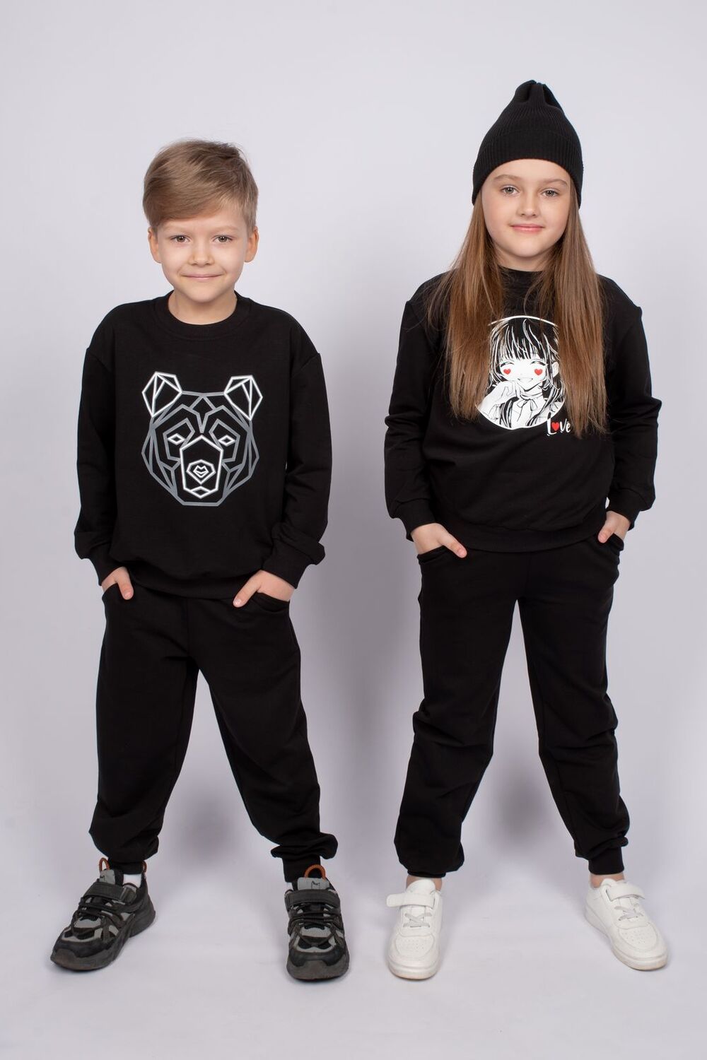 Комплект для девочки, состоящий из джемпера и брюк. Толстовка прямого силуэта со спущенным длинным рукавом. Горловина круглая, обработана воротником из кашкорсе. Рукав заканчивается манжетом из кашкорсе. По низу изделия пояс из кашкорсе. На полочке принт шелкография. Надпись переводится как Любовь. Брюки прямого силуэта. На изделии выполнены карманы с отрезным бочком и отлетной мешковиной. По низу изделия манжеты из кашкорсе. Цвет: черный; Материал: футер 2-х нитка;футер 2-х нитка; Состав: 92% хлопок 8% эластан.
