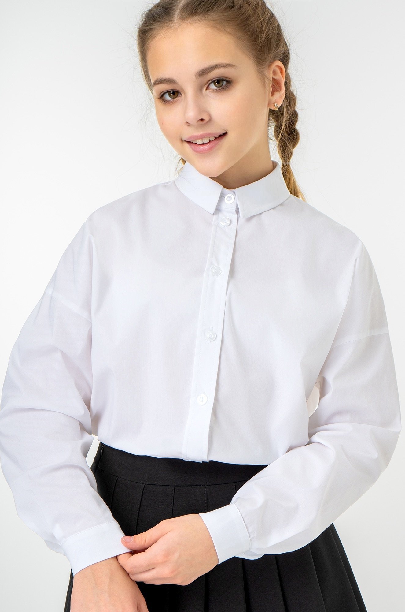 Бе..показатьлая рубашка оверсайз для девочек и девочек-подростков выполнена из приятного к телу хлопка. Аккуратный отложной воротник, классическая застежка на пуговицы и длинный рукав делают образ сдержанным и опрятным. Oversize добавляет расслабленного вайба любым образам! Свободная рубашка легко ощущается на теле.Детская однотонная рубашка выполнена из ткани батист, которая отлично пропускает воздух и позволяет телу дышать. Благодаря эластану в составе базовая модель отлично сохраняет форму после многократных стирок.