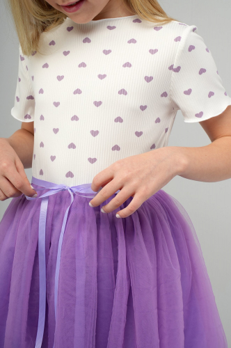 — принт сердечки на фактурной ткани лапша добавляет образу романтичности и очарования.