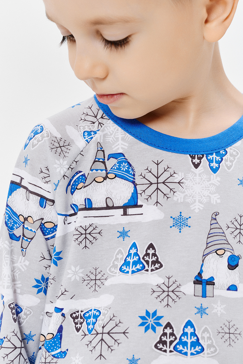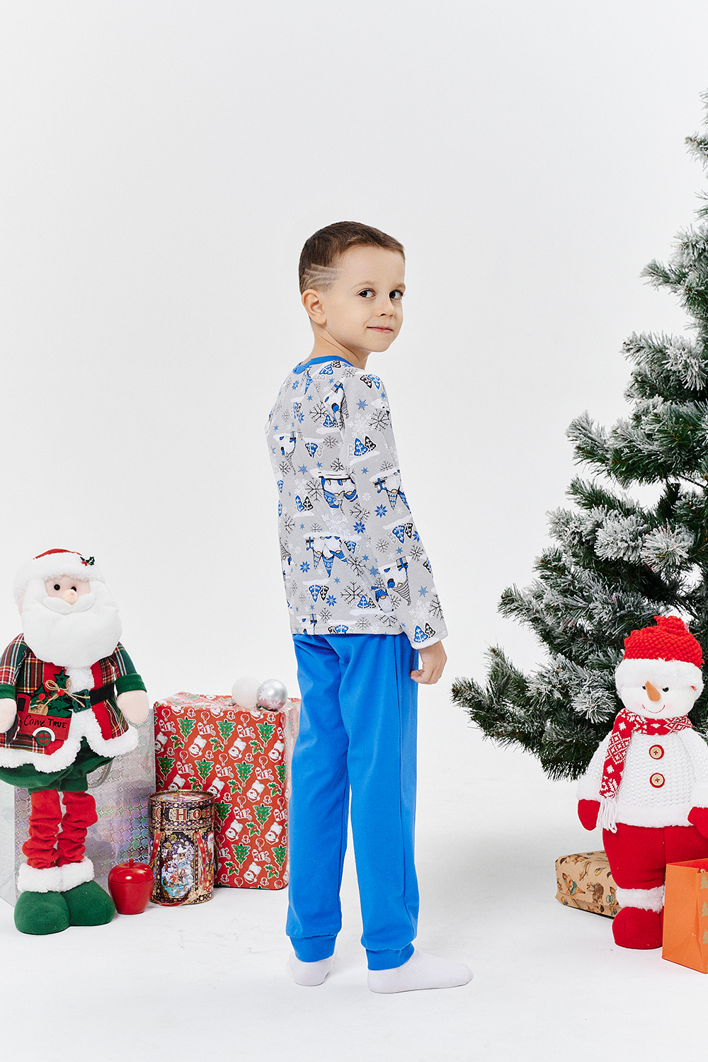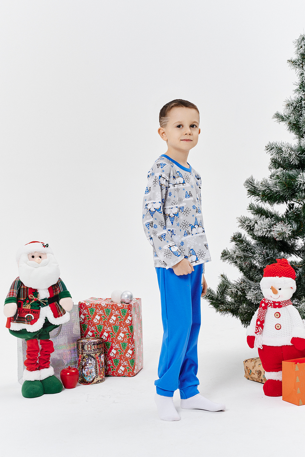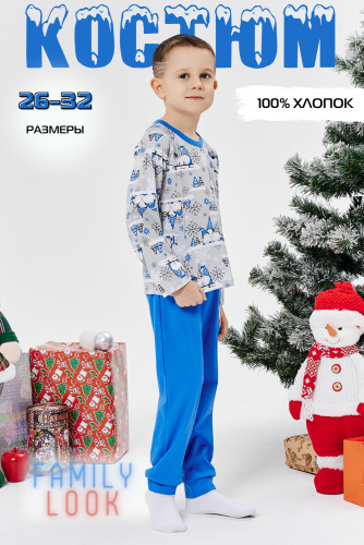 Костюм детский для мальчиков из кулирного полотна состоит из кофты и брюк. Кофта прямая, горловина круглая, обработана окантовкой, рукав длинный, реглан, низ изделия обработан на плоскошовной машине. Брюки прямые, верх на поясе с резинкой, спереди на брюках принт, низ изделия на плоскошовной машине. Данный костюм из серии Family look, к нему можете приобрести женский костюм: 42275, детский костюм для девочек: 42276, мужской костюм: 42274. Цвет: синий; Материал: кулирка;кулирка; Состав: 100% хлопок.