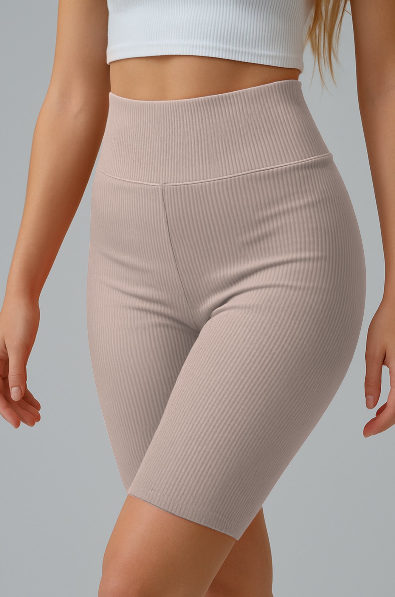Широкая эластичная резинка нежно прилегает и не сдавливает живот. Благодаря облегающему крою спортивные велосипедки в рубчик повторяют каждое движение тела.