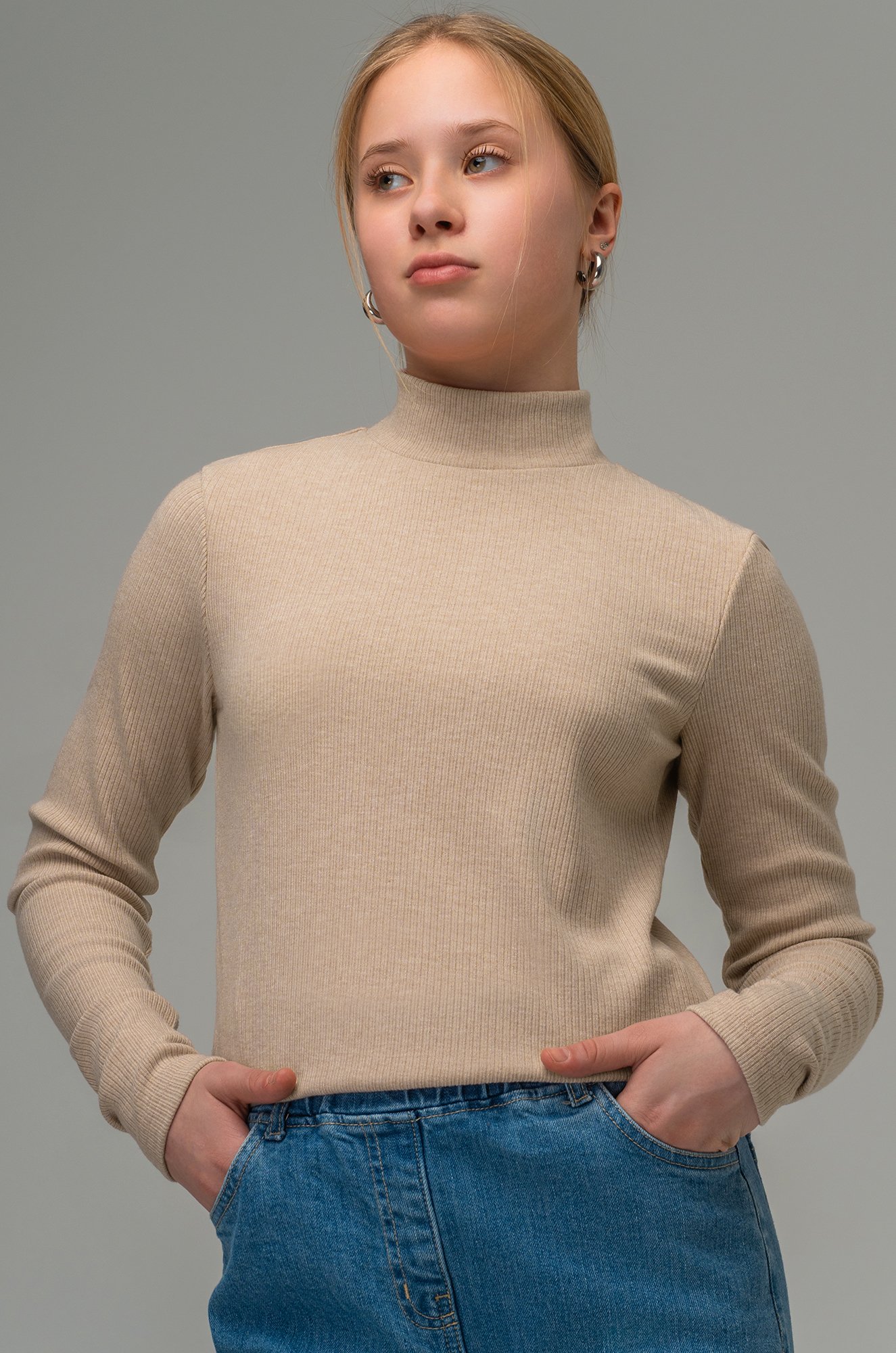 Длинные рукава и воротник-стойка прекрасно защищают в прохладные дни, а рубчик добавляет изящности. Однотонная бежевая водолазка легко сочетается с другими предметами школьного гардероба, что позволяет создавать новые стильные образы.