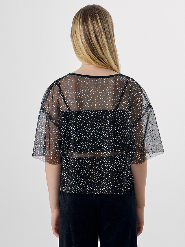 Верхняя блузка свободного силуэта. Перед и спинка цельнокроеные. Горловиа кругло формы, обработана бейкой из трикотажного кулирного полотна. Рукав втачной короткий, слека спущен. Нижняя блузка из трикотажного кулирного полотна на брителях. Верхняя и нижняя часть изделия соединины лентой атласной SFLA-1