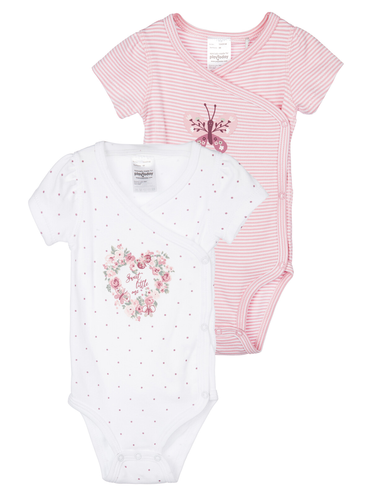 Боди с коротким рукавом из натурального хлопкового двойного трикотажа. 2 шт. в комплекте. 100% хлопок. Кнопки внизу – 2 ряда, боди растет вместе с малышом.