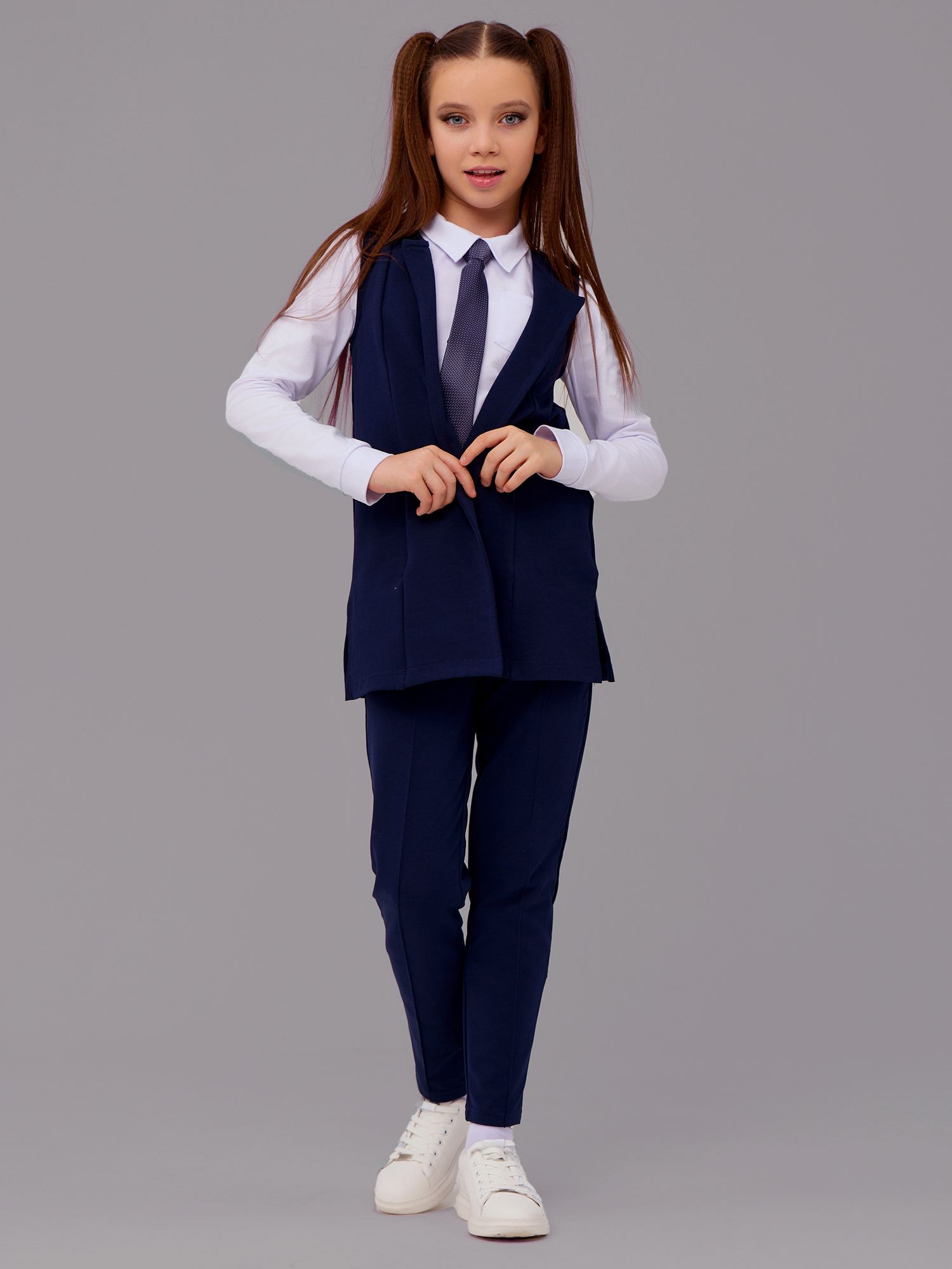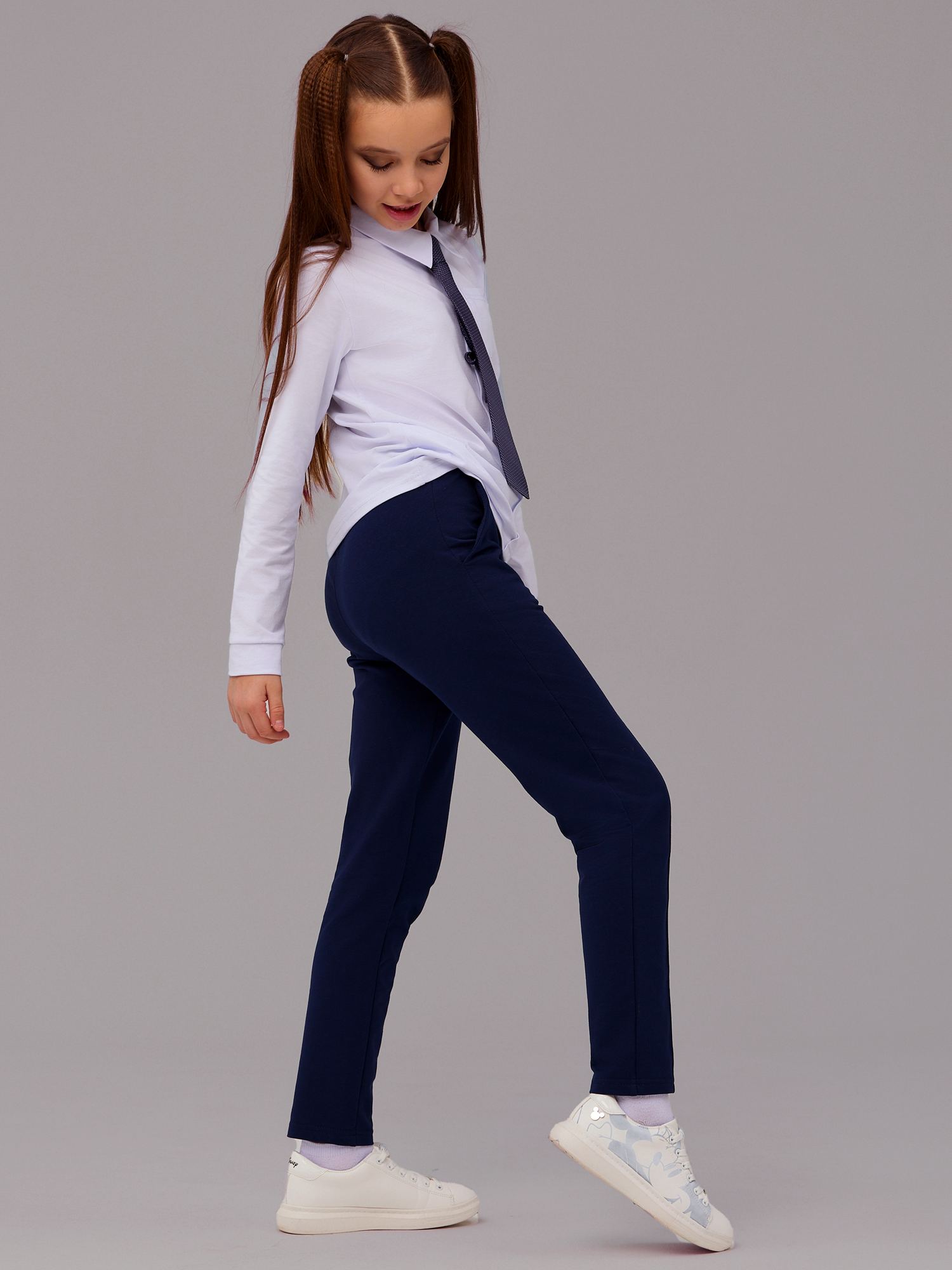 Прямые брюки из джерси с начесом темно-синего цвета для девочки. Пояс на резинке, по брюкам застроченная стрелка, и 2 боковых кармана.