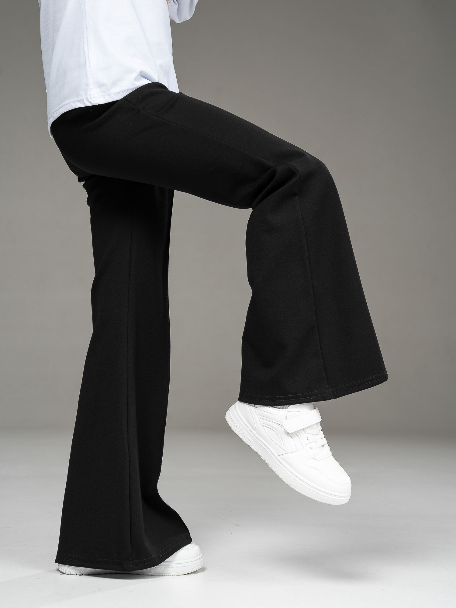 Стильные брюки-клеш из джерси черного цвета для девочки, облегающие по бедрам и расклешенные от колена. Спереди по центру - рельефный шов. Пояс на эластичной резинке.