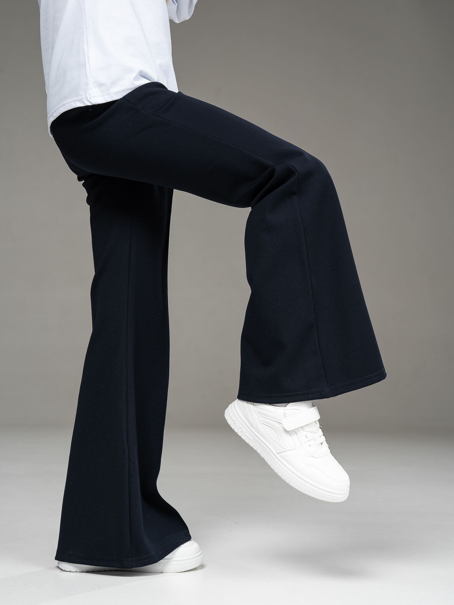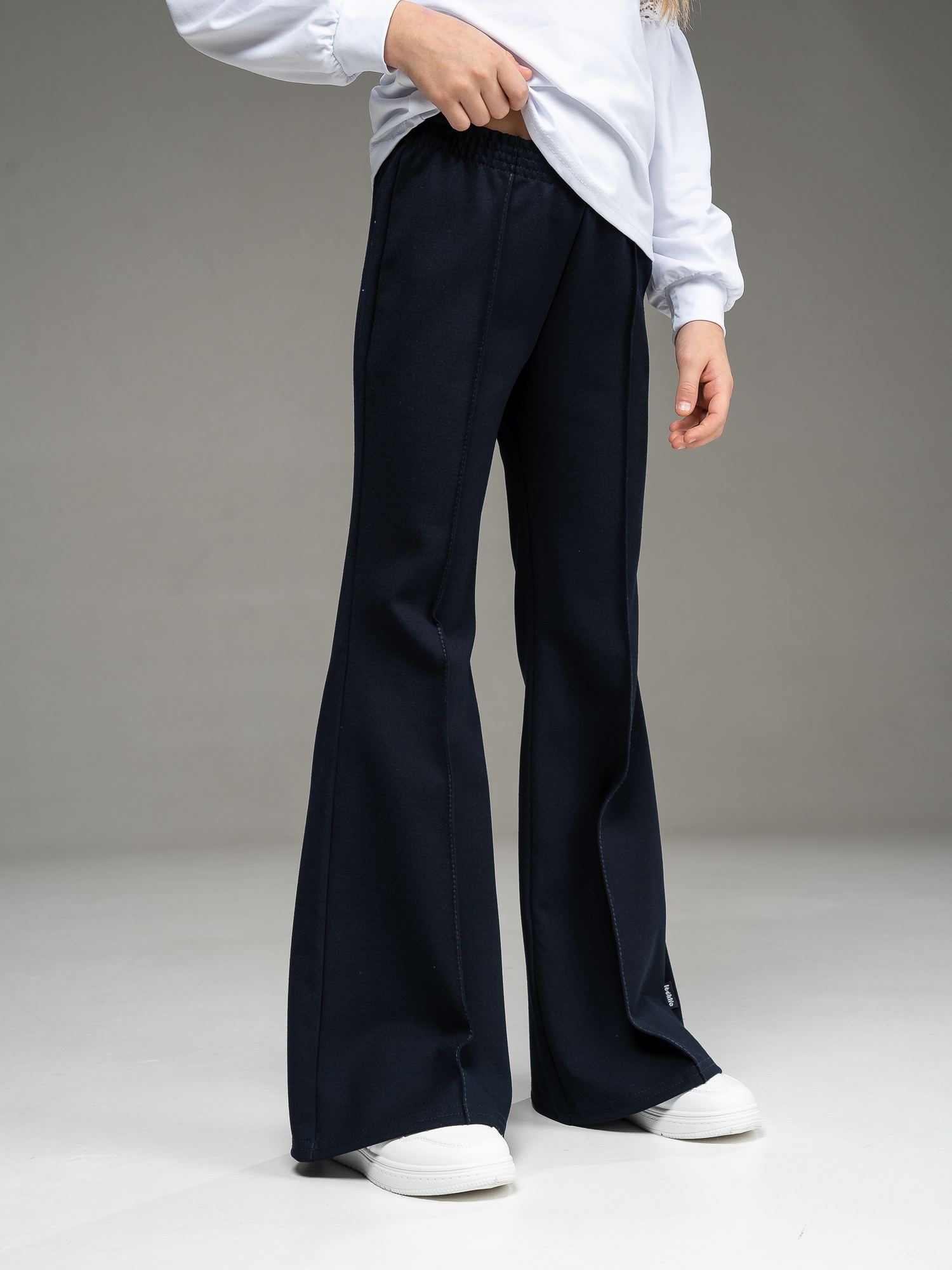 Стильные брюки-клеш из джерси темно-синего цвета для девочки, облегающие по бедрам и расклешенные от колена. Спереди по центру - рельефный шов. Пояс на эластичной резинке.