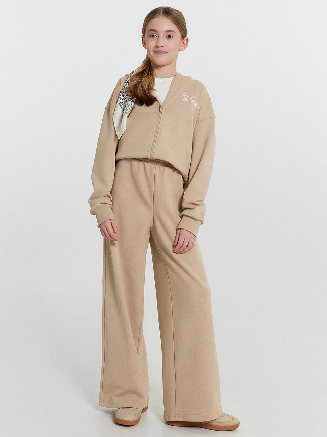 Брюки для девочек свободного силуэта. Пояс отрезной из основного полотна с эластичной тесьмой внутри 50RV. По поясу проложены отделочные строчки. Низ брюк обработан швом в подгибку.