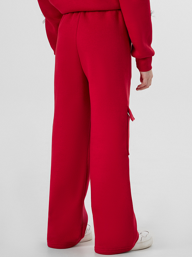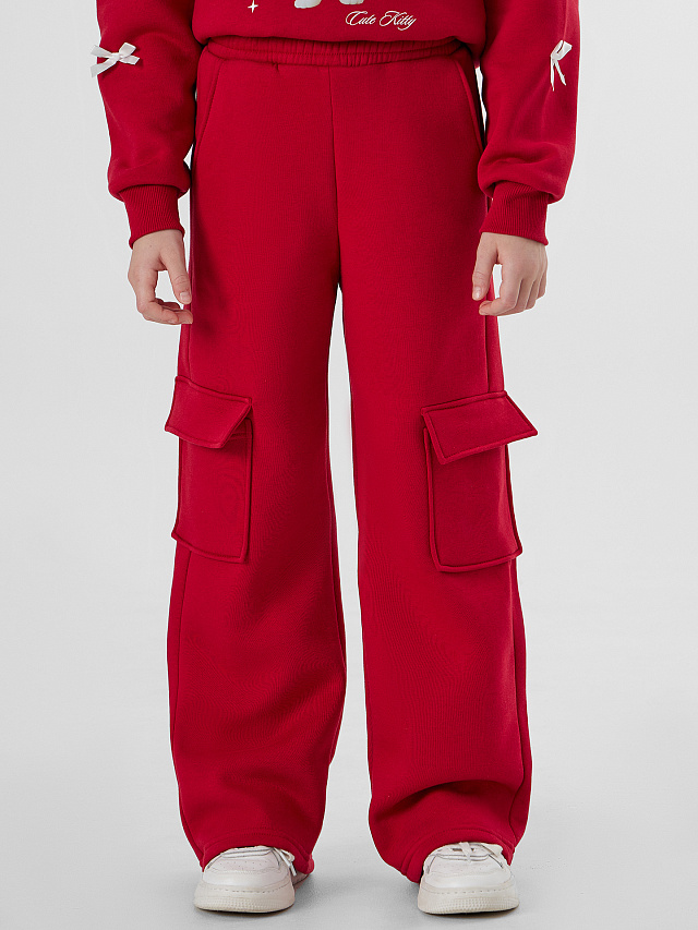 Брюки карго свободного силуэта из трикотажного полотна футер. Пояс отрезной с эластичной тесьмой внутри 50RV, по поясу проложены отделочные строчки, внутри пробиты петли и втянут шнур 8-PXC2. По переду карманы с отрезным бочком, с подкаладкой из трикотажного кулирного полотна. По боковым швам накладные карманы с клапаном.