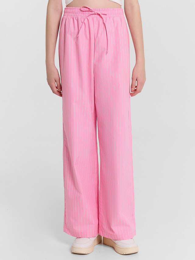 Брюки прямого силуэта. Посадка на талии. Пояс отрезной по переду гладкий, задняя деталь пояса с резиной внутри 40RV. По переду изделия карманы с отрезным бочком. Низ изделия обработан швом в подгибку.