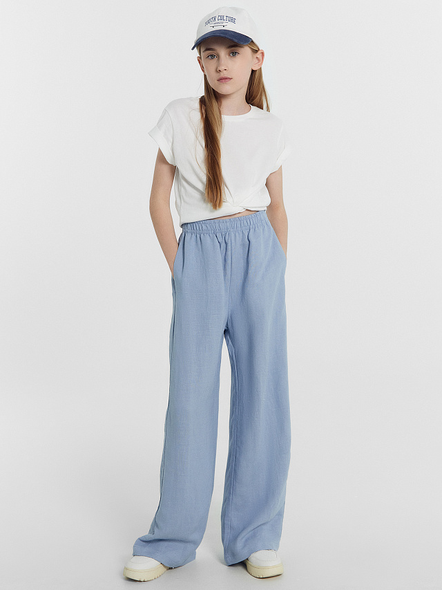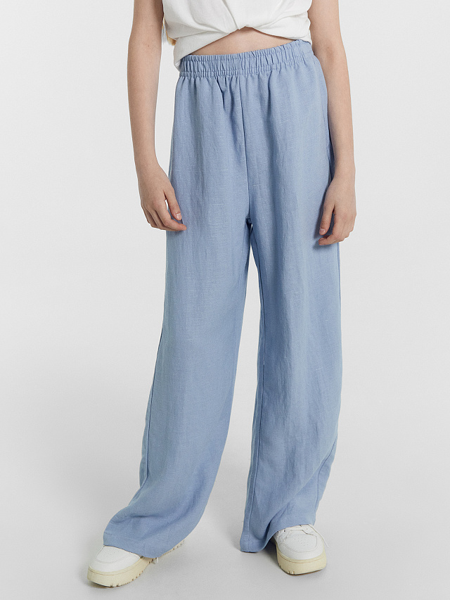 Брюки для девочек серо-голубые из вискозы и льна