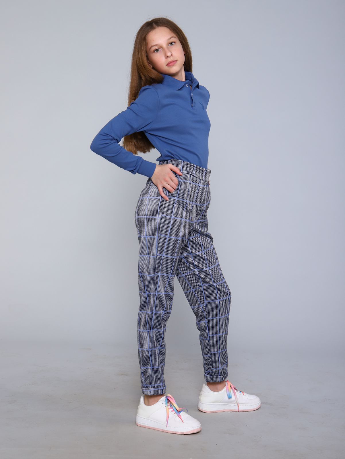 Подростковые штаны в классическом стиле, прямого кроя, зауженные к низу, длина немного укорочена, с подгибом, с карманами в боковых швах.