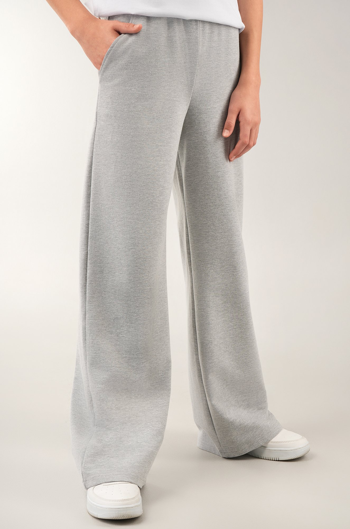 Широкие брюки базового светло-серого цвета подойдут для физкультуры в школе, для прогулок и для посещения школьных секций. Плотные хлопковые штаны – прекрасный вариант на весну и осень. Брюки подойдут для образов на каждый день.