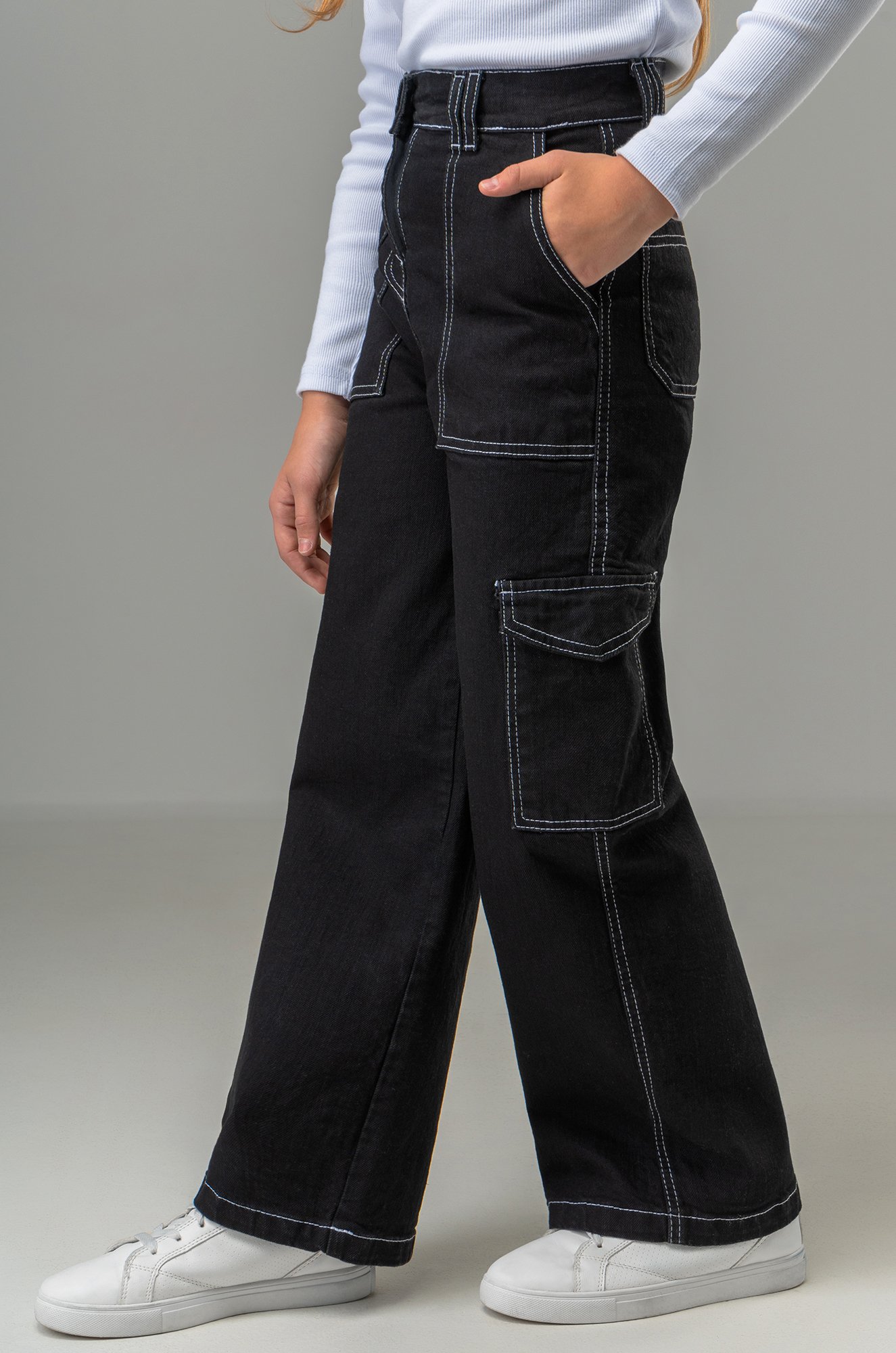 Д..показатьобавьте в гардероб девочки стильные черные джинсы палаццо с высокой посадкой — идеальный выбор для создания ярких образов! Подростковые брюки с накладными карманами карго станут настоящим хитом, позволяя юной девушке чувствовать себя комфортно и уверенно.