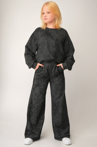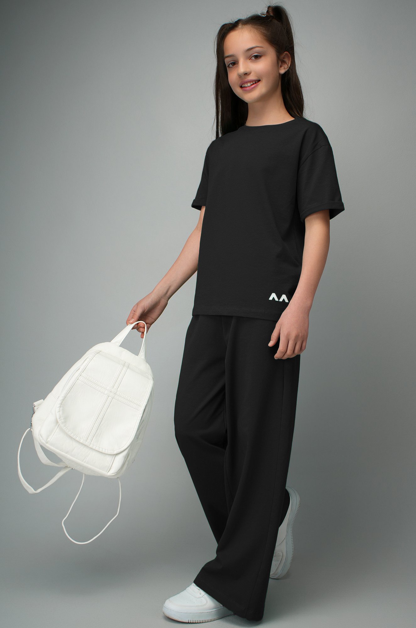 Трикотажный костюм с брюками для девочек и девочек-подростков выполнен из хлопковой ткани кулирная гладь. В комплект черного цвета входят футболка свободного кроя и брюки палаццо.