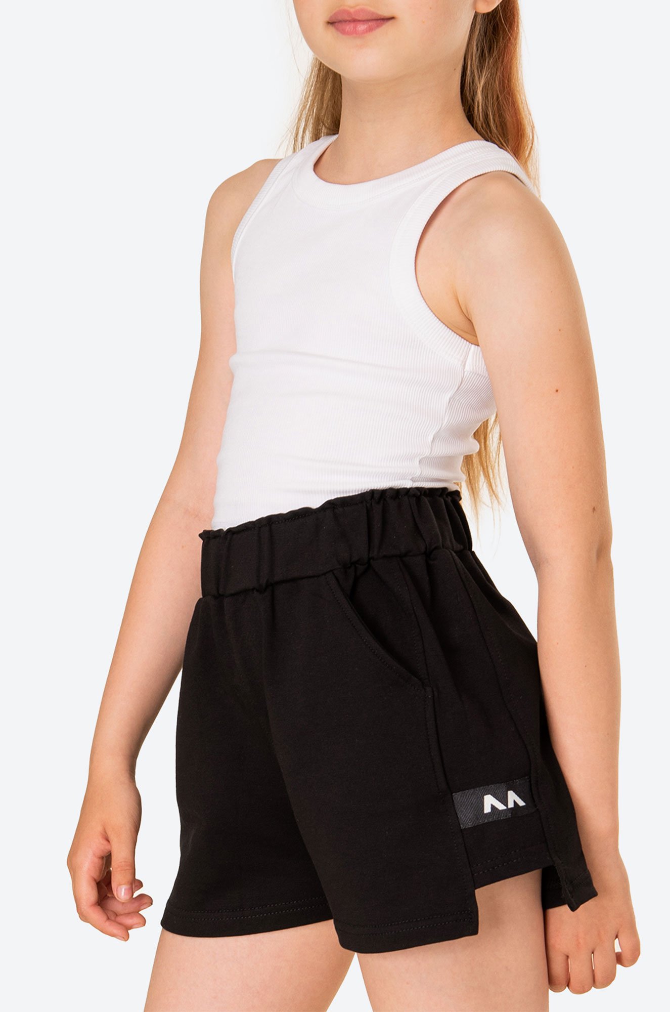 Короткие шорты для девочки и девочки подростка выполнены из футера двухнитки премиального качества. Стильные детские шорты с эффектными вырезами по бокам украшены фирменным знаком с ушками. На шортах расположены удобные карманы для необходимых мелочей.