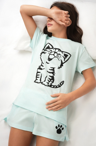 Детская пижама для девочки и девочки подростка — отличный выбор для сна и отдыха. Чёрная футболка со спущенным плечом украшена принтом Лапки, а штаны дополнены атласным бантом на поясе и забавным рисунком.