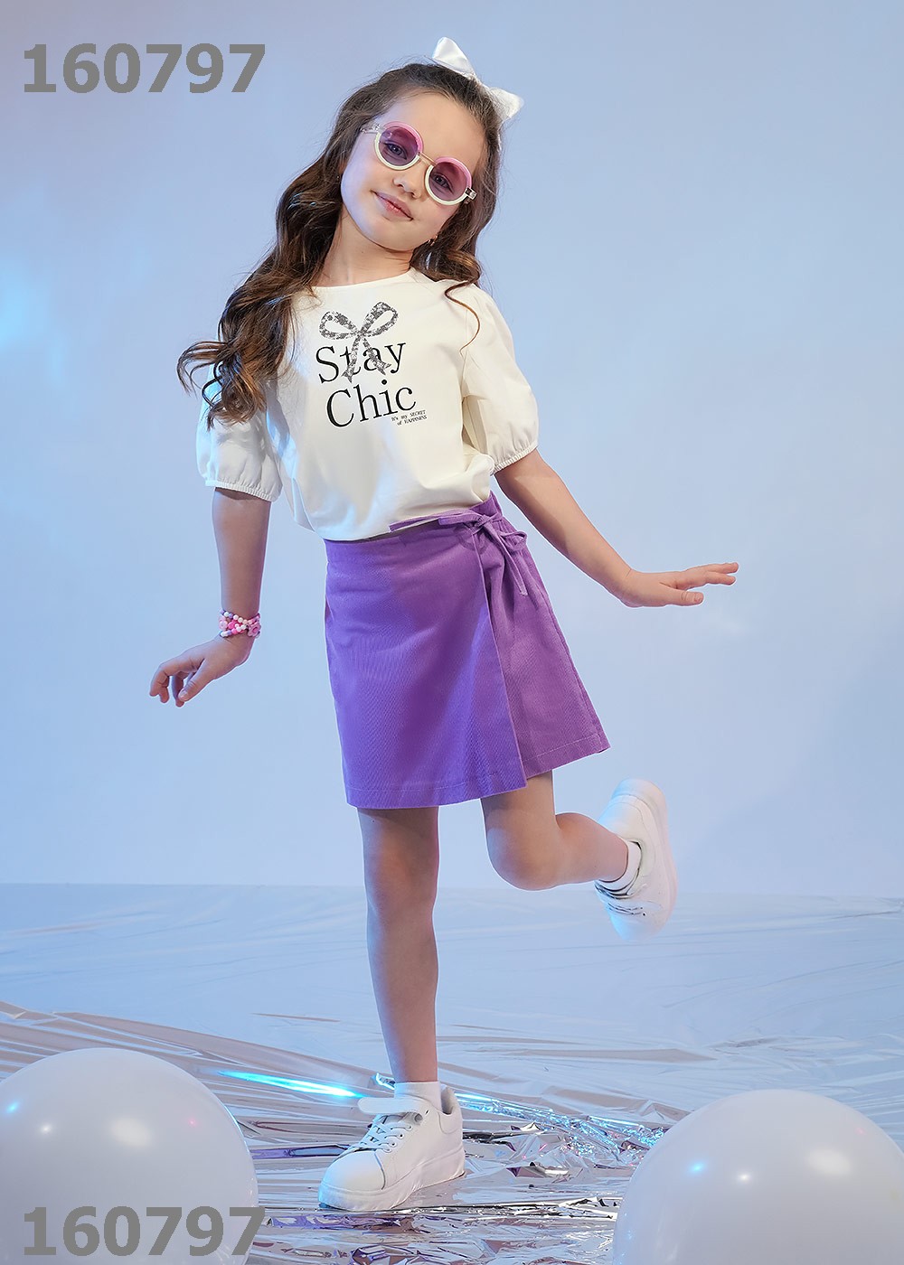 "Описание: Стильная светло-фиолетовая юбка-шорты из мягкого микровельвета с запахом по переду. Модель дополнена декоративной завязкой и комфортной резинкой на талии, создающей изящный силуэт. Сочетай юбку-шорты с рубашкой и футболками из новой коллекции!