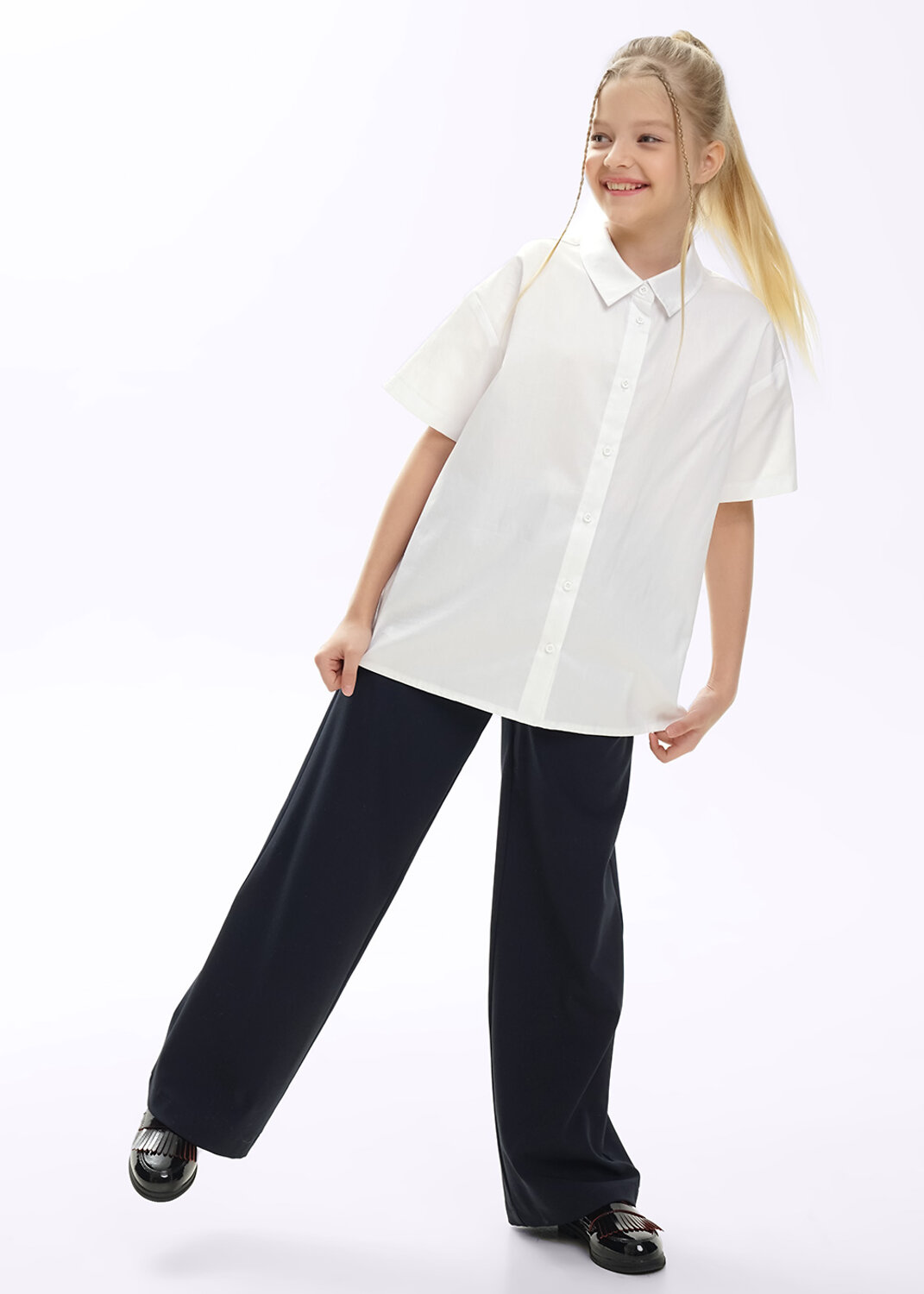 Стильные широкие брюки из костюмной ткани позволят создать стильный школьный образ. Удобный эластичный пояс, карманы. Базовые цвета для школы- черный и синий. Костюмный материал с вискозой.