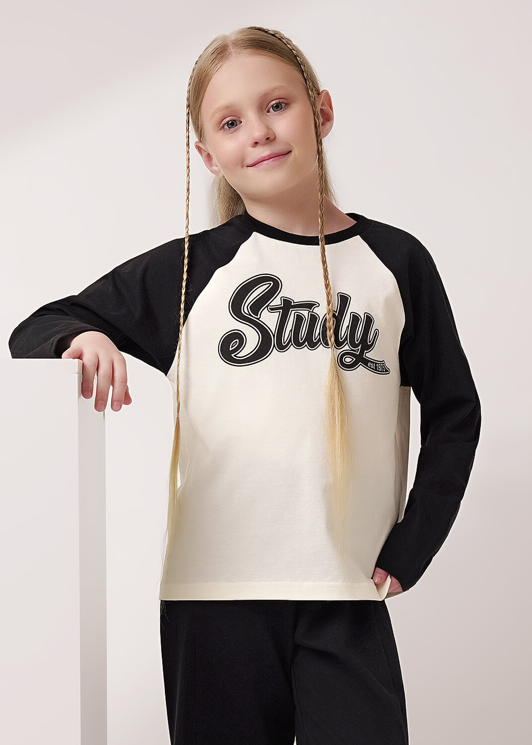 Стильный лонгслив из хлопкового трикотажа- то, что нужно для твоего классного лука! Покрой рукава реглан, контрастная горловина и рукава, стильный дизайнерский принт- всё для твоего отличного настроения!