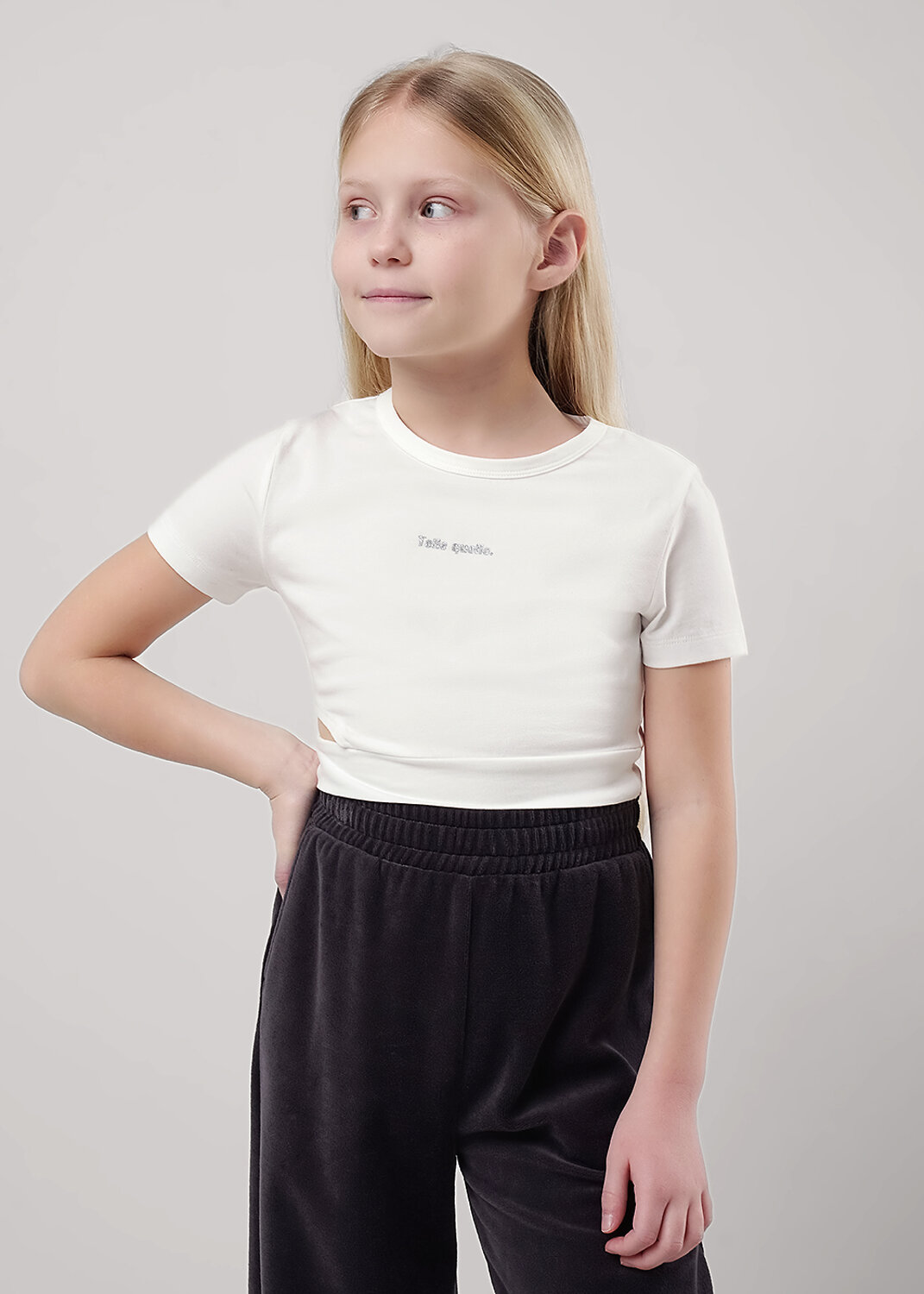 Стильная укороченная футболка с разрезом из эластичного хлопка. Комфортная посадка, актуальная моделЬ, которую легко сочетать с любимыми джоггерами или юбкой в складку. Небольшой декор голографичной плёнкой добавит яркий акцент.
