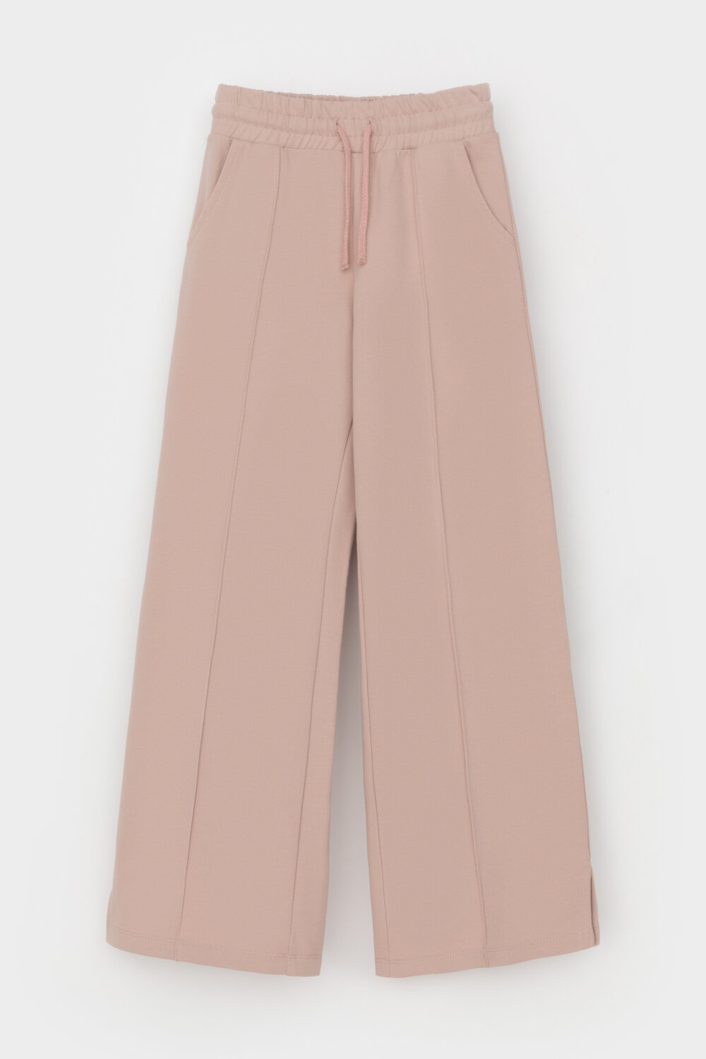 Брюки для девочки прямого кроя с застроченными стрелками и боковыми карманами из мягкого петельчатого футера. Пояс со шнурком позволяет регулировать посадку. Идеальный и комфортный вариант на каждый день.
